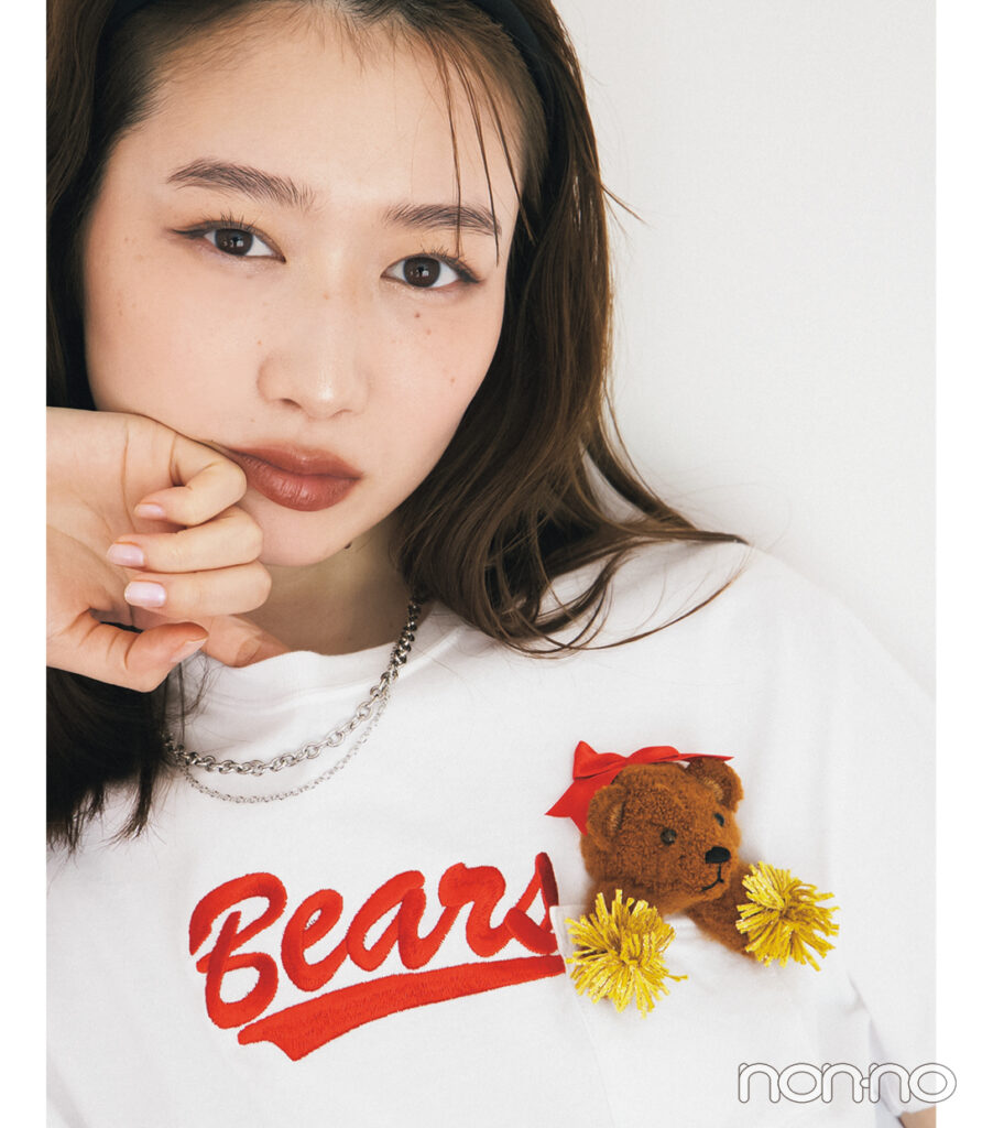 チアリーダーに扮したクマちゃんが胸ポケットから顔を出したTシャツはひと目見たら忘れられない存在感! ともすると子どもっぽく見えがちだから、ミュールサンダルで女っぽさを加算。