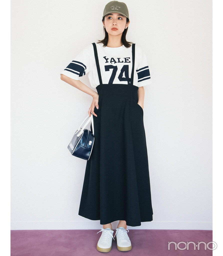 Tシャツ¥13200/ヘインズブランズ ジャパン カスタマーセンター(チャンピオン) ジャンパースカート¥12100/シップス インフォメーションセンター(シップス エニィ) 帽子¥12100/COEL イヤリング¥2420/サンポークリエイト(アネモネ) バッグ¥8800/フリークス ストア渋谷(アンブロ×フリークス ストア) 靴¥25300/リーガル コーポレーション(クレイ)