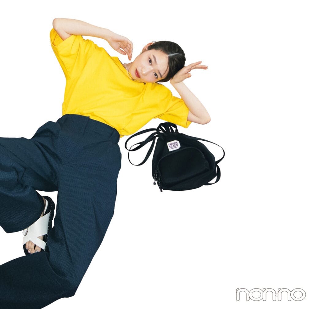Tシャツ¥1199/GRL(グレイル) パンツ¥3850/SPINNS バッグ¥13200/サムソナイト・ジャパン(グレゴリー) ヘアクリップ¥2200/Phoebe 靴下¥1980/テンベア トウキョウ 靴¥16500/アディダス コールセンター(アディダス オリジナルス)