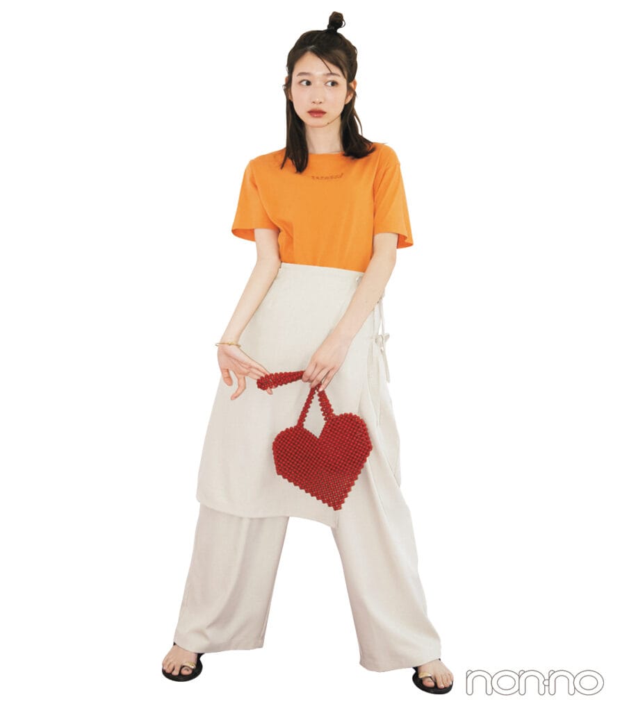 Tシャツ(ウェブ限定)¥4950/Ungrid スカート&パンツセット¥8030/ジーンズ ファクトリー 卸団地本店(ネノム) イヤカフ¥2640・バングル¥2750/Phoebe バッグ¥10780/セムインターナショナル(ザ バグマティ) 靴¥10780/ル タロン 有楽町マルイ店