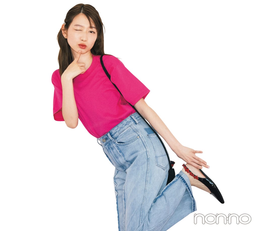 愛嬌たっぷりなチアTはシンプルボトムで際立てて