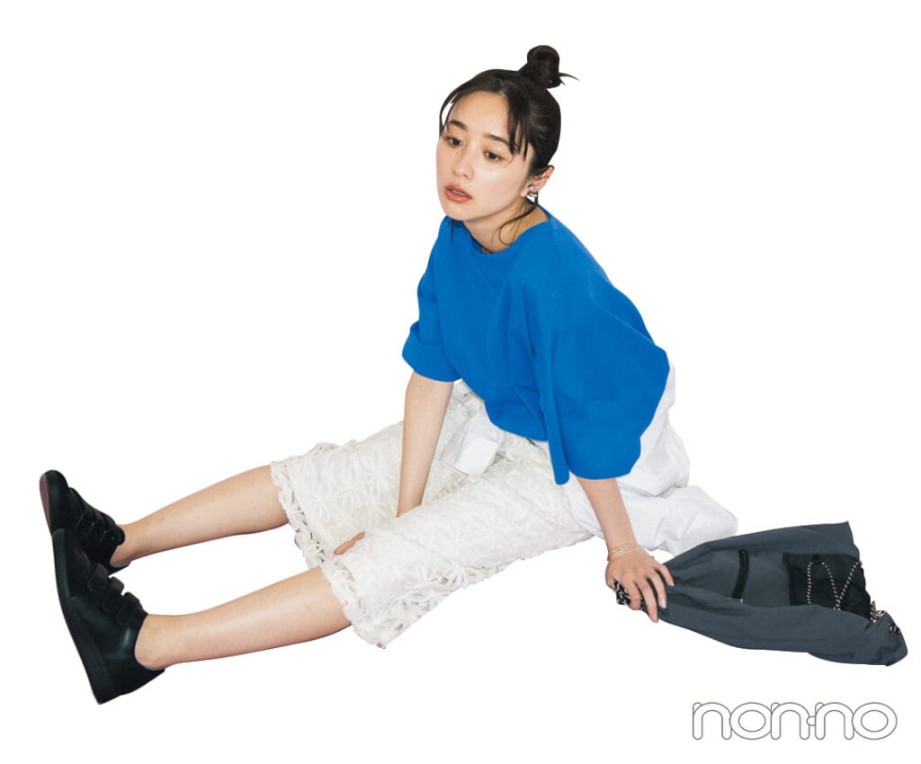 Tシャツ(白Tシャツつき)¥2090/FTLジャパン(フルーツオブザルーム) パンツ¥24200/ヤマツゥ(157woadblue) ヘアピン¥1357/サンポークリエイト(アネモネ) イヤリング¥2200/お世話や(OSEWAYA) バッグ(一部店舗のみ販売)¥1290/GU バッグにつけたスカーフ¥9900/ドレステリア 渋谷スクランブルスクエア店 靴¥16500/ダイアナ 銀座本店