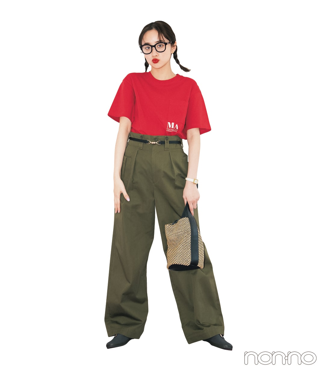 Tシャツ¥5995/Firsthand パンツ¥33000/ザ エディット ストア(タンジェント) メガネ¥49500/ソスト イヤリング¥7700/ロードス(Jewel tree) 時計¥17600/クルース ベルト¥1290/GU バッグ¥27500/ル タロン 有楽町マルイ店(マルコ マージ) 靴¥8800/ムーンスター カスタマーセンター