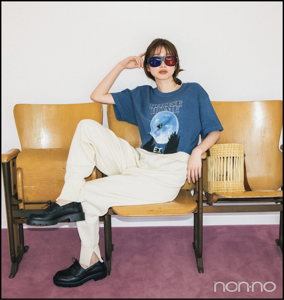 Tシャツ¥1990/GU © UCS LLC and Amblin パンツ¥13970/MURUA シュシュ¥4400/アーバンリサーチ ルミネ新宿店(デコール アーバンリサーチ) イヤリング¥2310・リング(5個セット)¥2310/お世話や(OSEWAYA) バッグ¥9900/Firsthand 靴¥8800/ル タロン 公式オンラインストア(ル デコレ)