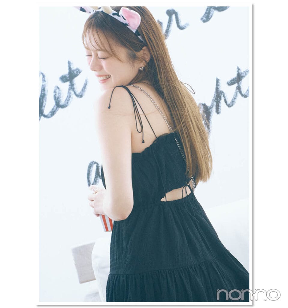 バックシャンな肌見せを選べば、後ろ姿の写真が盛れる! 甘いリボンディテールやミニ丈も色選びでヘルシーに昇華。