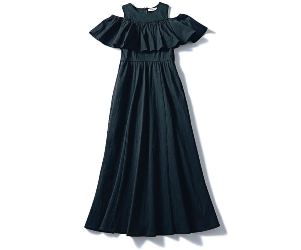 ハリのある胸元のフリルのおかげで、肩がきゃしゃ見え!