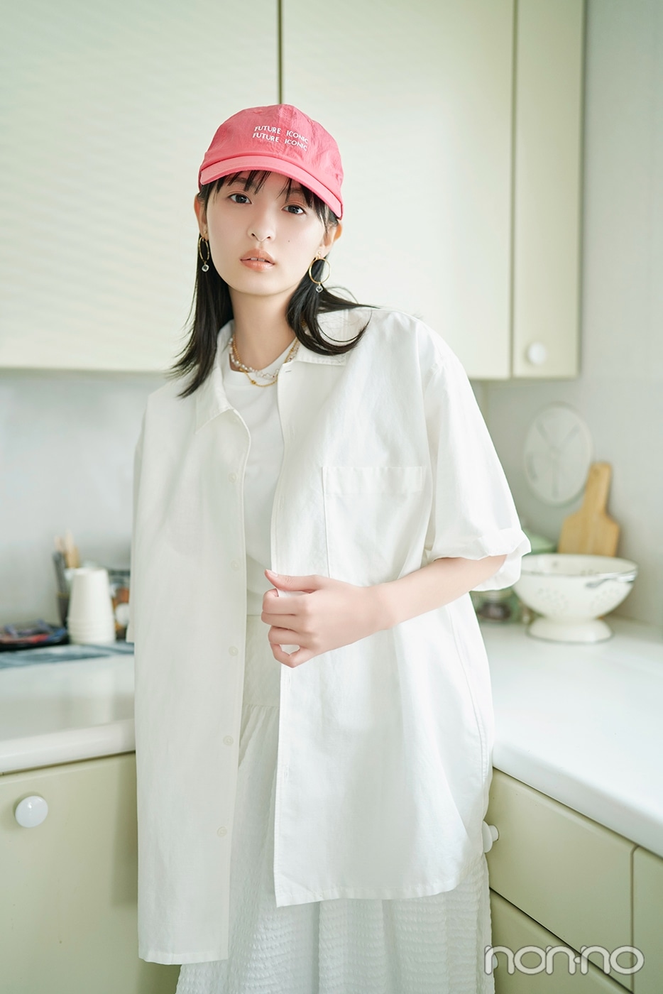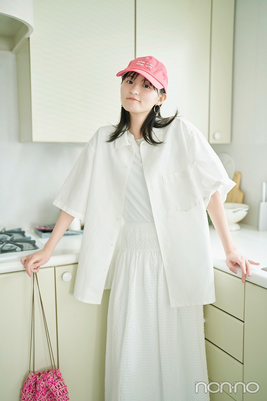 ゆるめのシルエットにビッグポケットをあしらったシャツをはおった、こなれ感MAXのオールホワイトコーデ。素材違いの白アイテムで全身をまとめてピンク小物を散りばめたら、リラックスしつつアガるコーデが完成♪ コンサバになりがちな白シャツも、リネンの風合いがほどよく印象をやわらげて肌なじみ良好に。