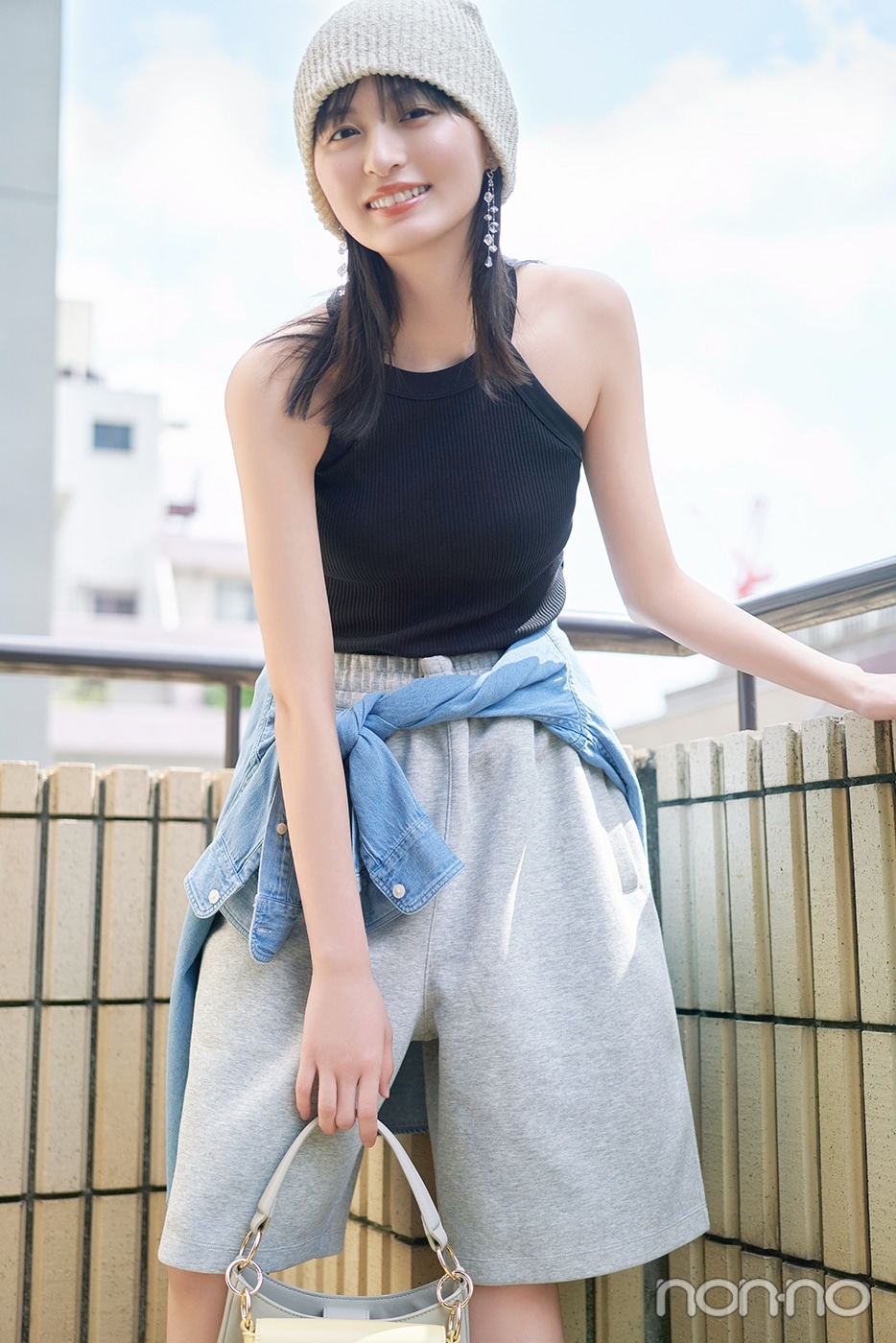 帽子¥3630/フリークス ストア渋谷(フリークス ストア) イヤリング¥13800/ロードス(KUMIKO MURAKAMI) バッグ¥12650/アルテミス by ダイアナ アーバンドック ららぽーと豊洲店 靴¥17050/ダイアナ 銀座本店