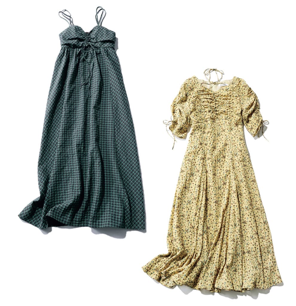 (左)程よいラフさが出せるレトロチェックのAラインワンピ。凹凸のあるさらりとした生地で蒸し暑い夜でも涼しく着心地も◎。