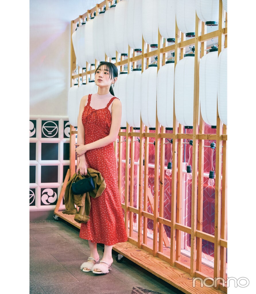 ノスタルジックなムードを漂わせる小花柄のキャミワンピ。ベビーピンクのノースリニットを下に仕込んで、チアフルにお祭り気分を満喫。