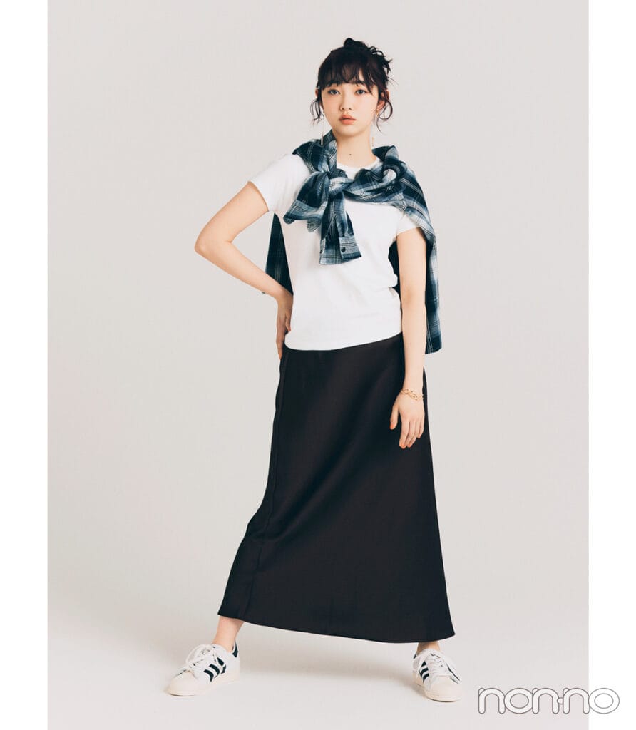 Tシャツ¥1490/無印良品 銀座 シャツ¥22000/Carhartt WIP Store Harajuku(Carhartt WIP) スカート¥8990/MANGO イヤリング¥4290/805ショールーム(マチルダローズ) ブレスレット¥2200/お世話や(OSEWAYA) 靴¥18700/アディダス コールセンター(アディダス オリジナルス)