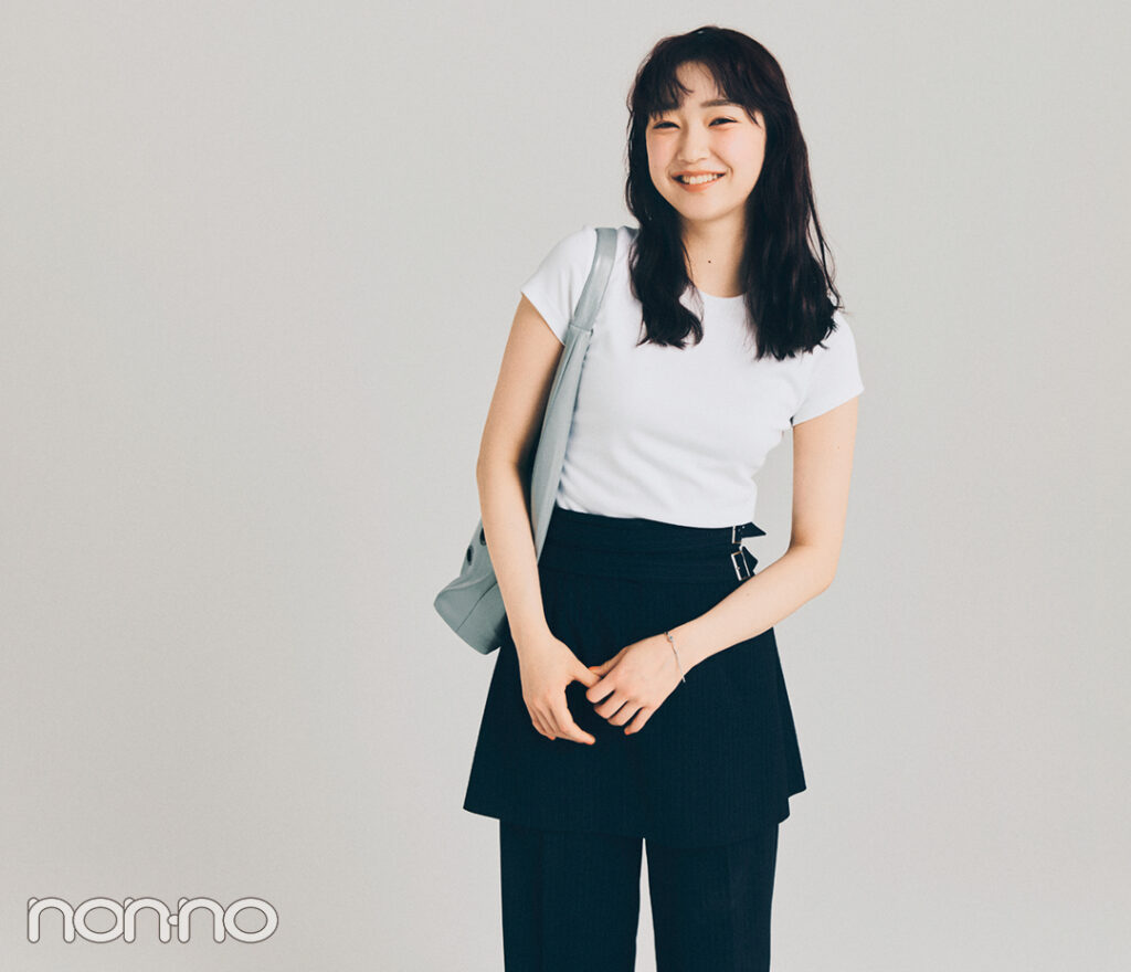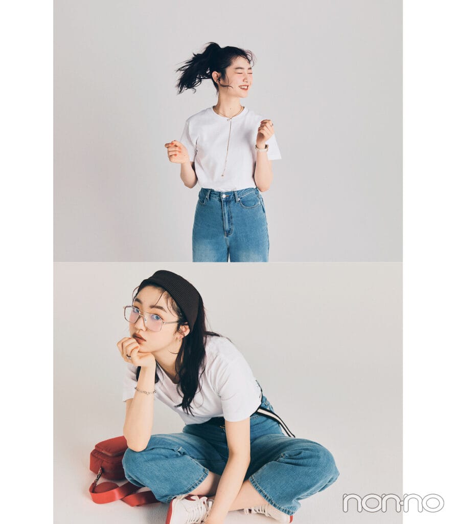おへそまで覆うハイウエストボトムで上半身の面積を狭めることで、のっぺりぺたんと見えることを回避。首の詰まった白Tで重心もアップ。