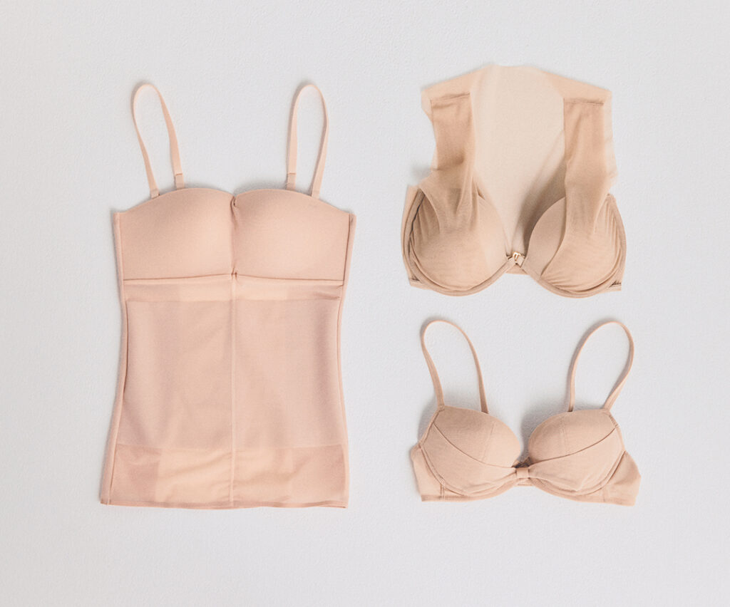 (右上)柔らかなパワーネットとブラカップが合体。つるんとした表面で服に響かず、食い込みがないので背中まですっきり。