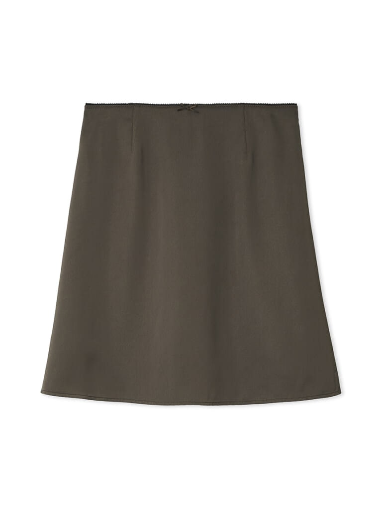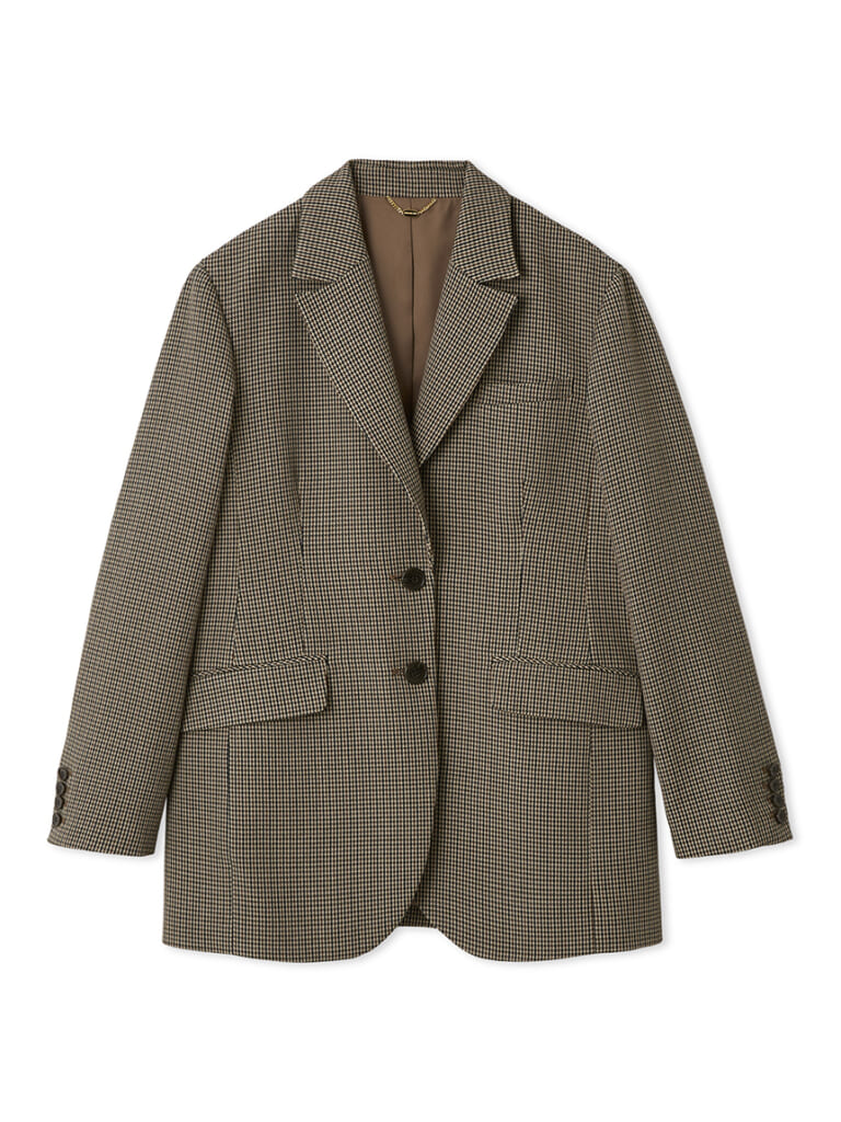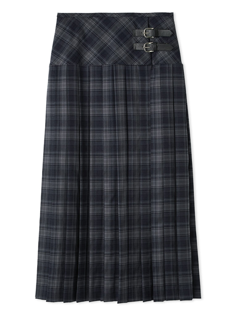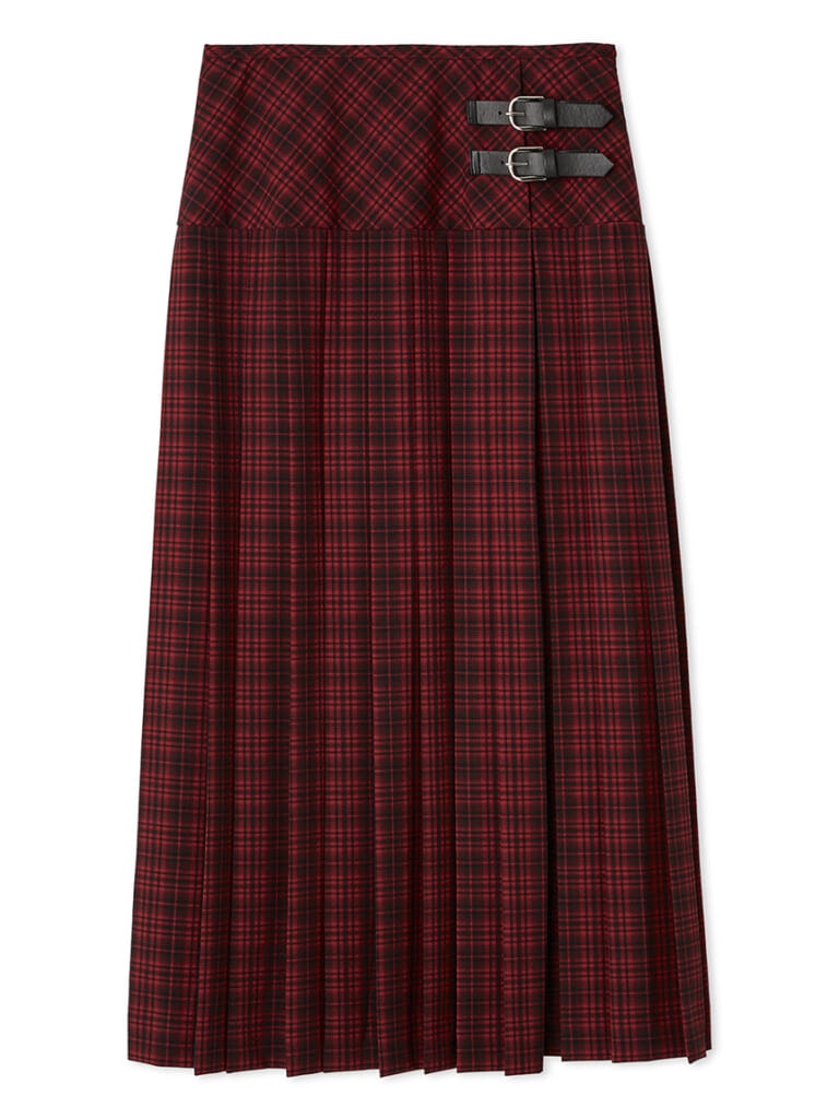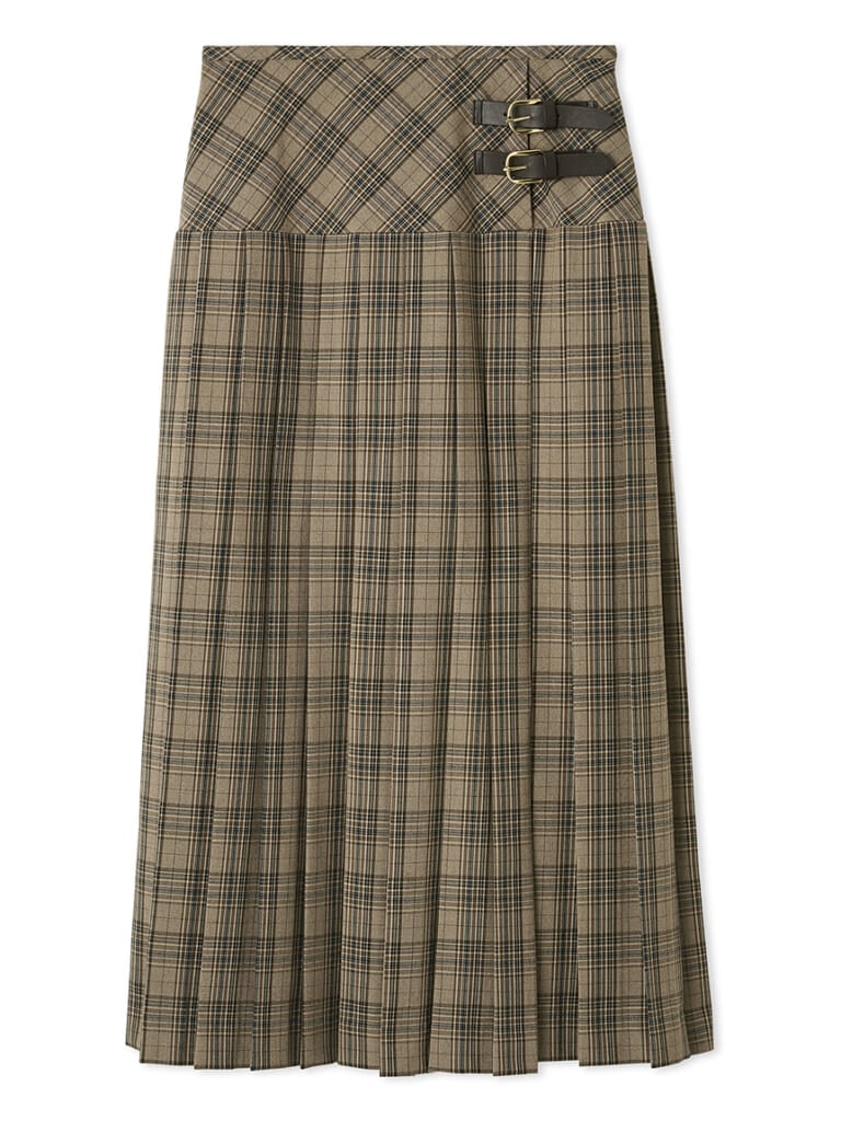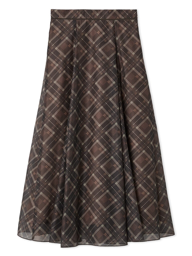 シアーな質感とブラウンベースのチェック柄スカートなら今季らしい着映えと上品さを約束。タイトなダークブラウンのニットで色をつなげつつ、フィット&フレアなシルエットをメイク。