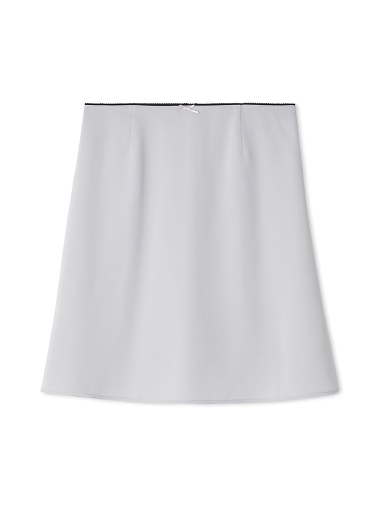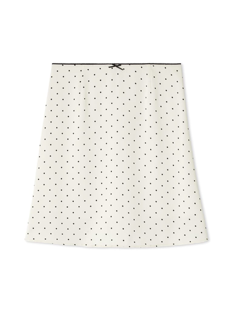 白のサテン地に小さな黒ドットをあしらったレディなスカート。気品あふれるチェックツイードジャケットを合わせて令嬢っぽく着るのが今の気分。足元は白ソックス×ストラップシューズでガーリーに仕上げて。