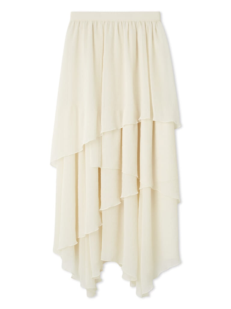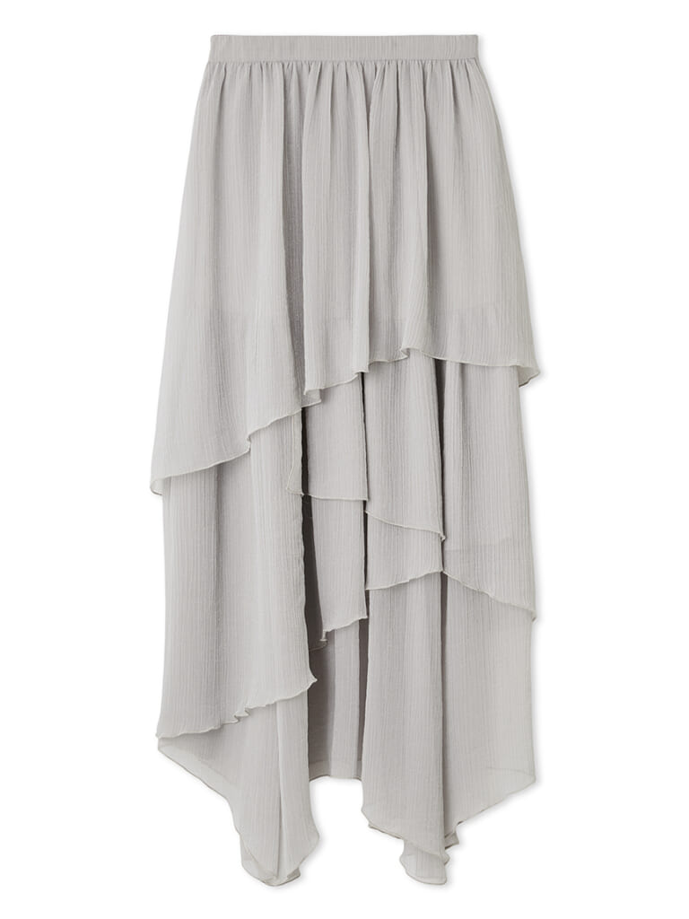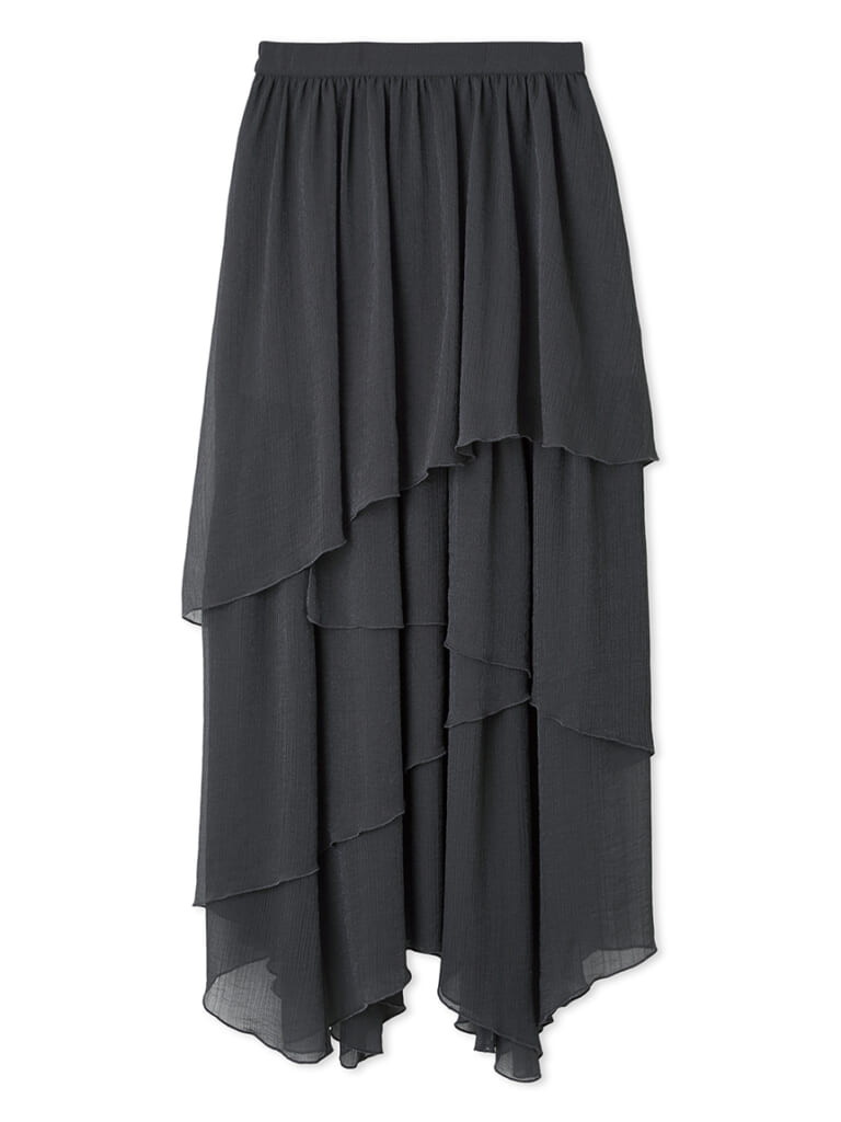 動くたび裾が揺れるアシンメトリーラッフルのスカートがリリー ブラウンから登場。透け感のある淡色タートルを合わせて、優しい色合いのフェミニンコーデを楽しんで。肩に掛けた黒カーディガンが全体の引き締め役に。ロゴトートやスニーカーでカジュアルダウンさせて。