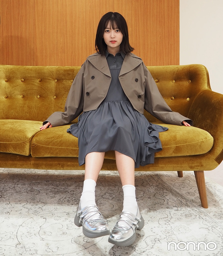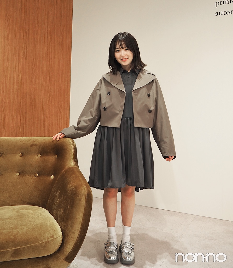 秋になれば薄手のアウターをオン! 合わせたトレンチコートもGUとrokhのコラボアイテム。ミニワンピスタイルには目線を上に引き上げてスタイルアップを叶えてくれるショート丈がやっぱり好相性!