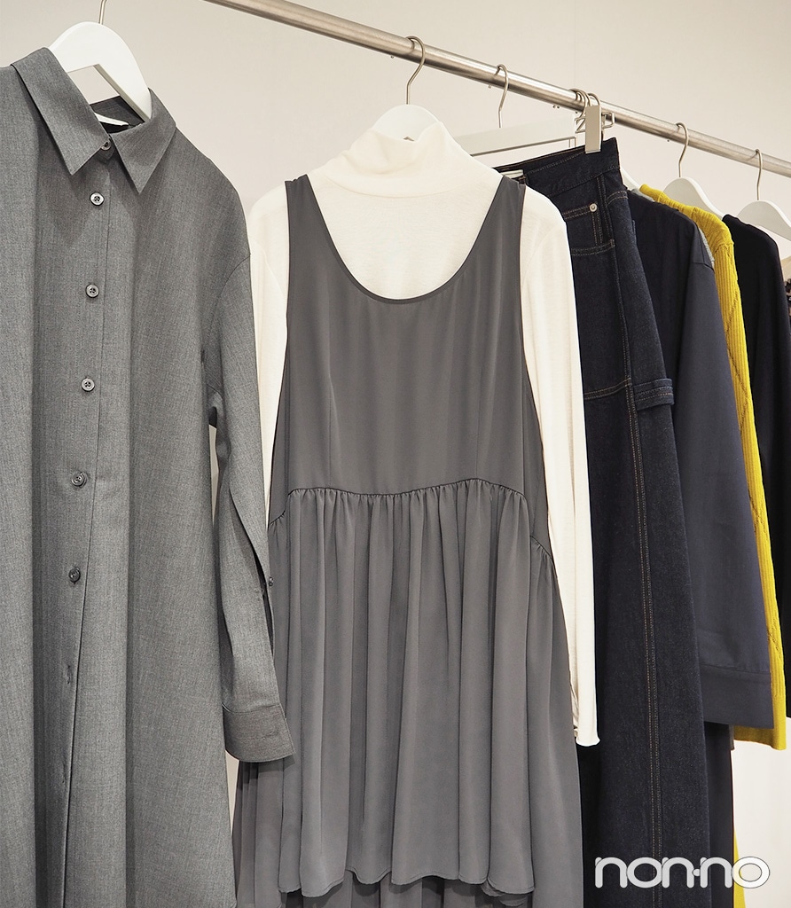 秋から冬まで着回すならニットワンピースがおすすめ! 温かみのあるマスタードイエローは、ありさも見た瞬間「秋っぽくて可愛い!」とときめいたカラー。こちらも衿付きニットとワンピースが分かれているので、それぞれ単体でも使える。