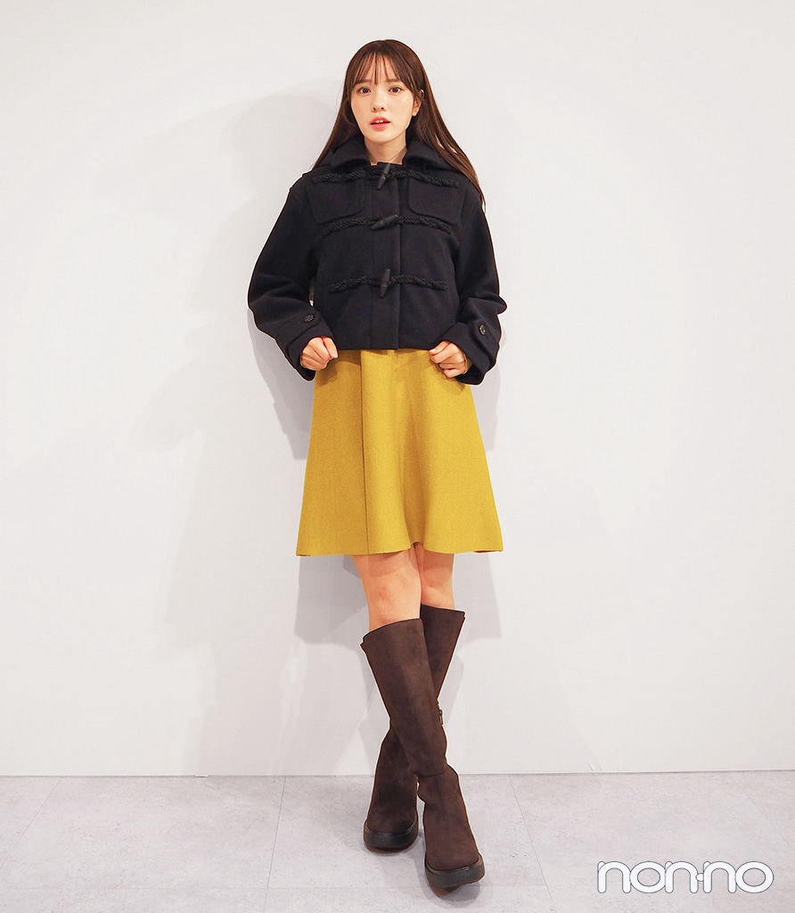 こっくりとしたマスタードイエローのワンピースには、ネイビーのダッフルコート合わせてトラッドなコーデに。コートもGU×rokhのコラボアイテムで、スタイルをよく見せてくれる短めの丈感とコンパクトなシルエットが今っぽい。