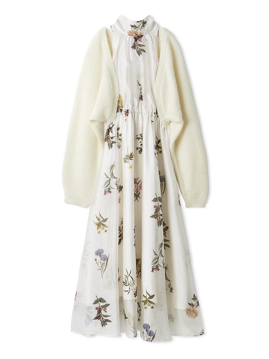 ロングワンピースとニットボレロのセットアイテム。シルク調素材の光沢感が上品な雰囲気を演出するワンピースは、アメスリデザインでトレンド感も抜群。ボレロとの隙間からちょっと肩をのぞかせて、抜け感ある着こなしに。10種類以上の花があしらわれたオリジナルのフラワーモチーフはおしゃれな女友達からも褒められる! 裏地つきなのもうれしいポイント。