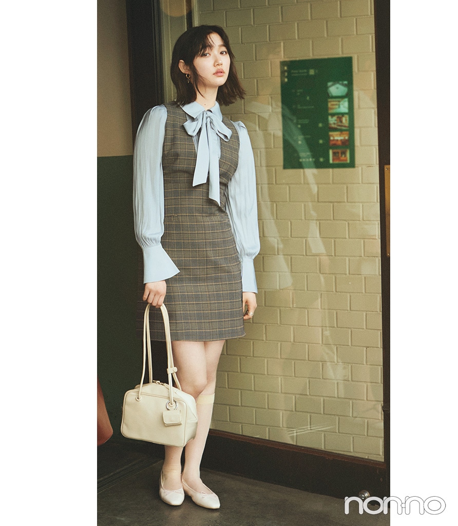 ブルーにグレーというシックな配色が、ミニ&ボウタイシャツの甘さの調整役に。レイヤード風の一枚で楽してしゃれ顔。