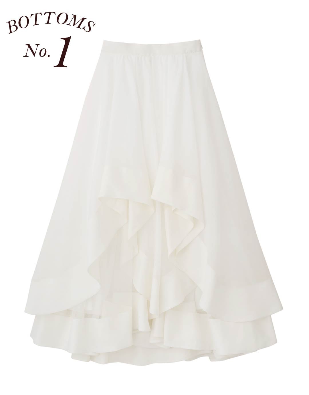 やわらかに透けるスカートを春風にふわりとなびかせて、新しい季節を華やかに彩りたい。裾の波立つラインがとびきりドレッシーな一着は、表側はオーガンジー、中はチュール地を使用することでボリューム感たっぷりに。カジュアルなスウェットやハンサムなシャツを合わせて糖度オフすれば、大人に似合う甘さに仕上がる。