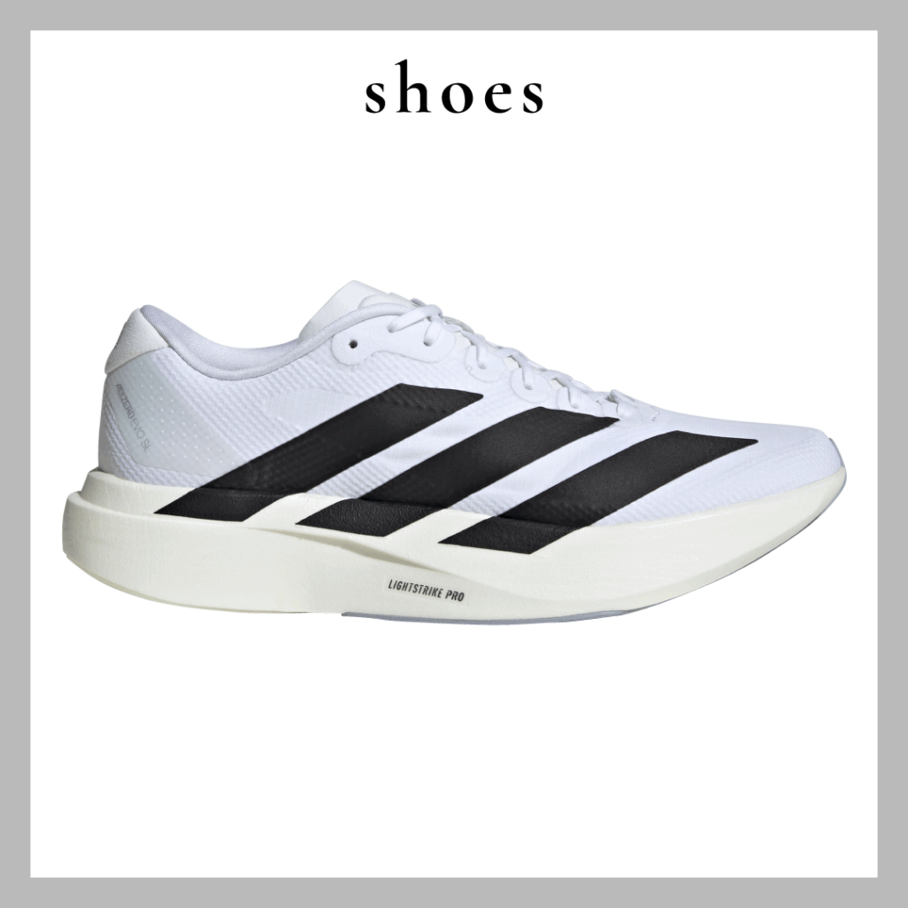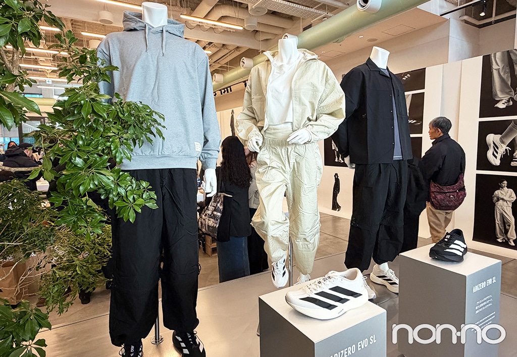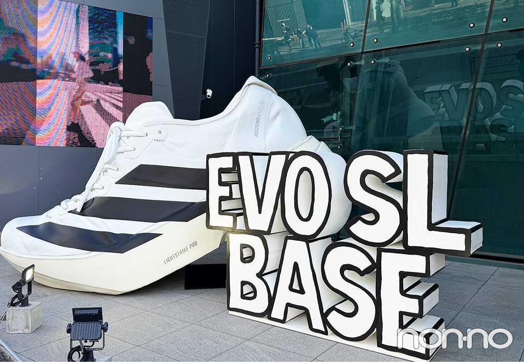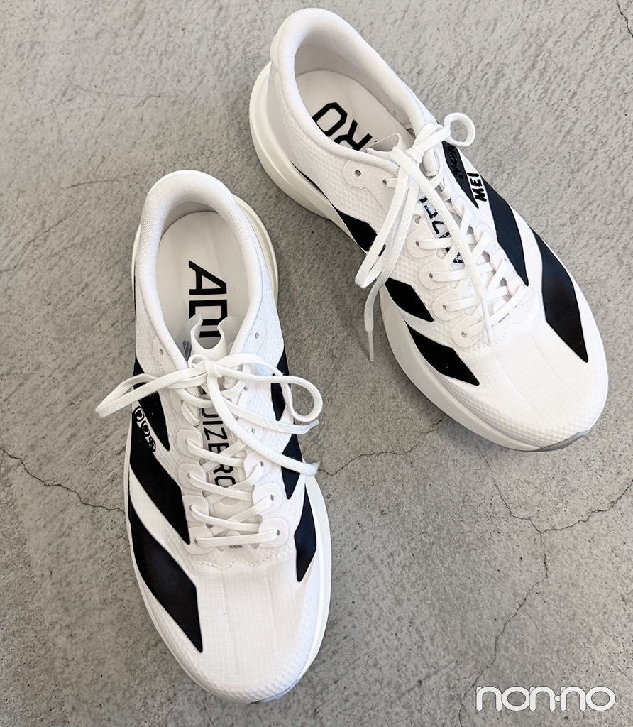 「ADIZERO EVO SL WOVEN」を絶賛愛用中のノンノウェブ編集M。驚くほどの軽量感、高い反発力が魅力で、いつもよりスピードを上げて練習したい時に重宝しています。厚底すぎないのでランニング初心者の方も扱いやすい◎。今回登場した、ブラック×ホワイトのカラーリングはとてもかっこよく、普段のコーデに合わせてもサマになります。1月30日(金)~2月1日(日)の3日間限定で開催されたポップアップスペース「EVO SL BASE」でお披露目された「DAY//Ø」と合わせたスタイリングも、都会的なおしゃれさにとても惹かれ真似したくなりました! このイベントでは、EVO SL WOVENに刺繡を施せるサービスもあり、ウェブ編集Mも好きな文字やマークを入れて、オリジナルの一足に仕上げていただきました♡