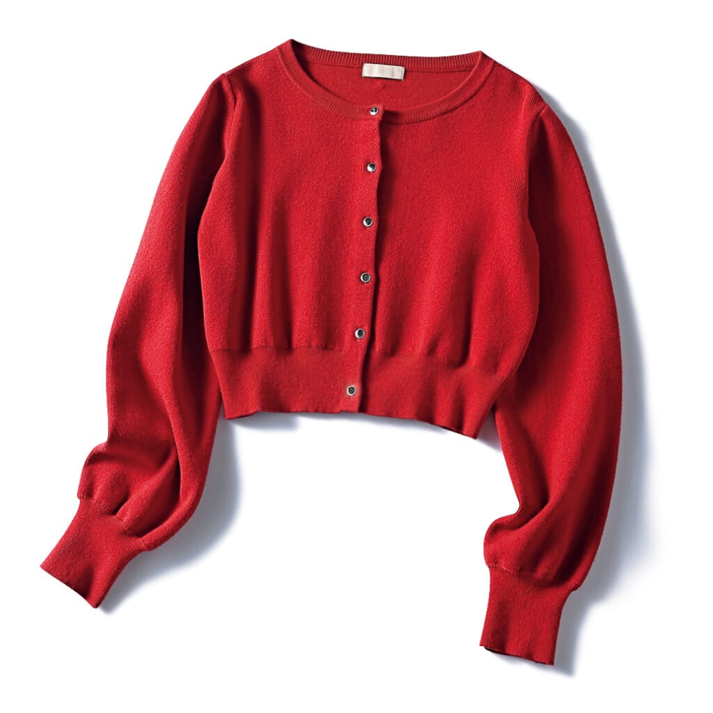2026春は"サムシングレッド"がトレンドカラー。はおっても肩にかけても使えるカーディガンはマストバイ。金ボタンつきのコンパクトサイズでパリシックなコーデに挑戦。