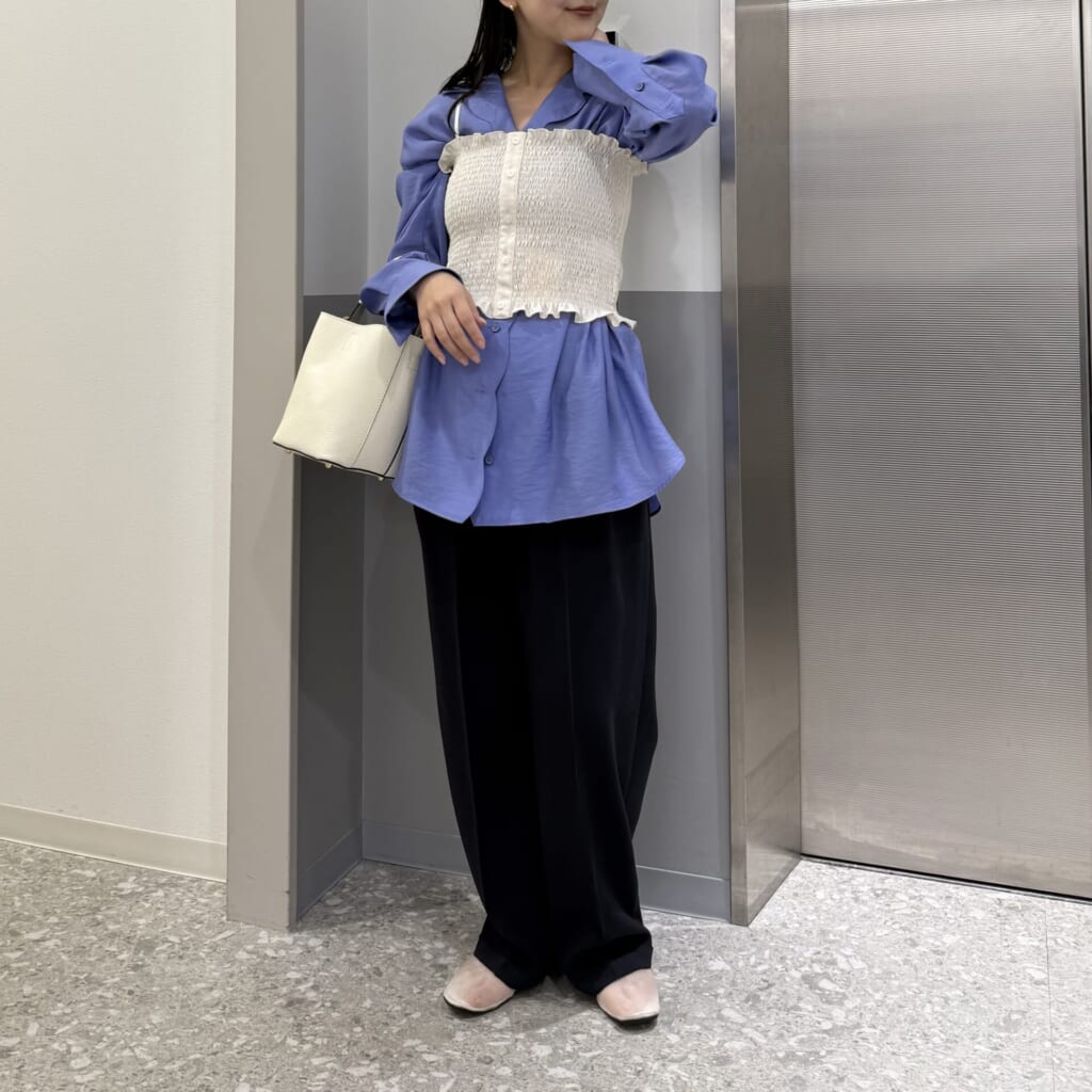 ストレートパンツ¥20,790・シアータンブラーオーバーシャツ¥15,290・ビスチェ¥18,590(オフショルダートップスとのセット販売)/CIS.(取扱店:すべてSUIT SQUARE TOKYO GINZA店) その他/モデル私物