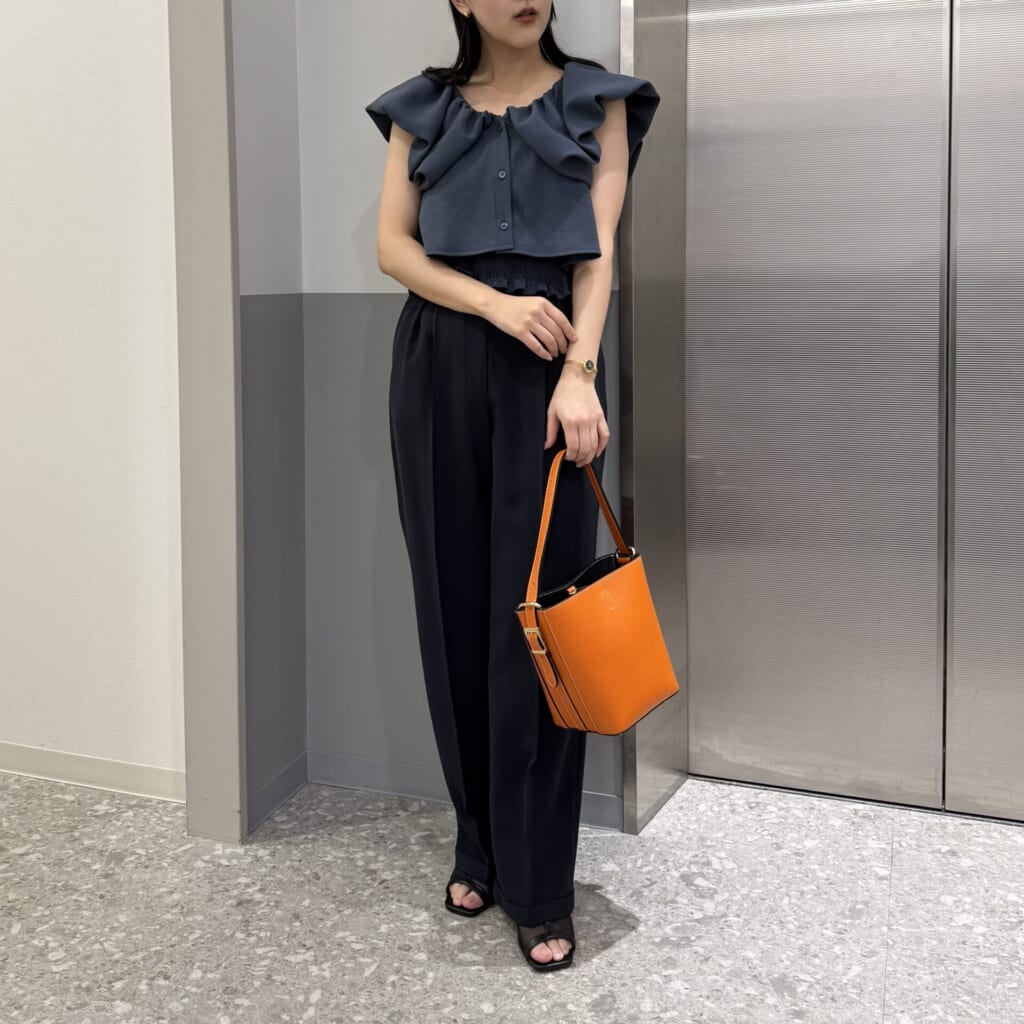 ストレートパンツ¥20,790・オフショルダートップス&インナーキャミソール¥18,590/CIS. バッグ¥24,090/MARCO BIANCHINI(取扱店:すべてSUIT SQUARE TOKYO GINZA店) その他/モデル私物