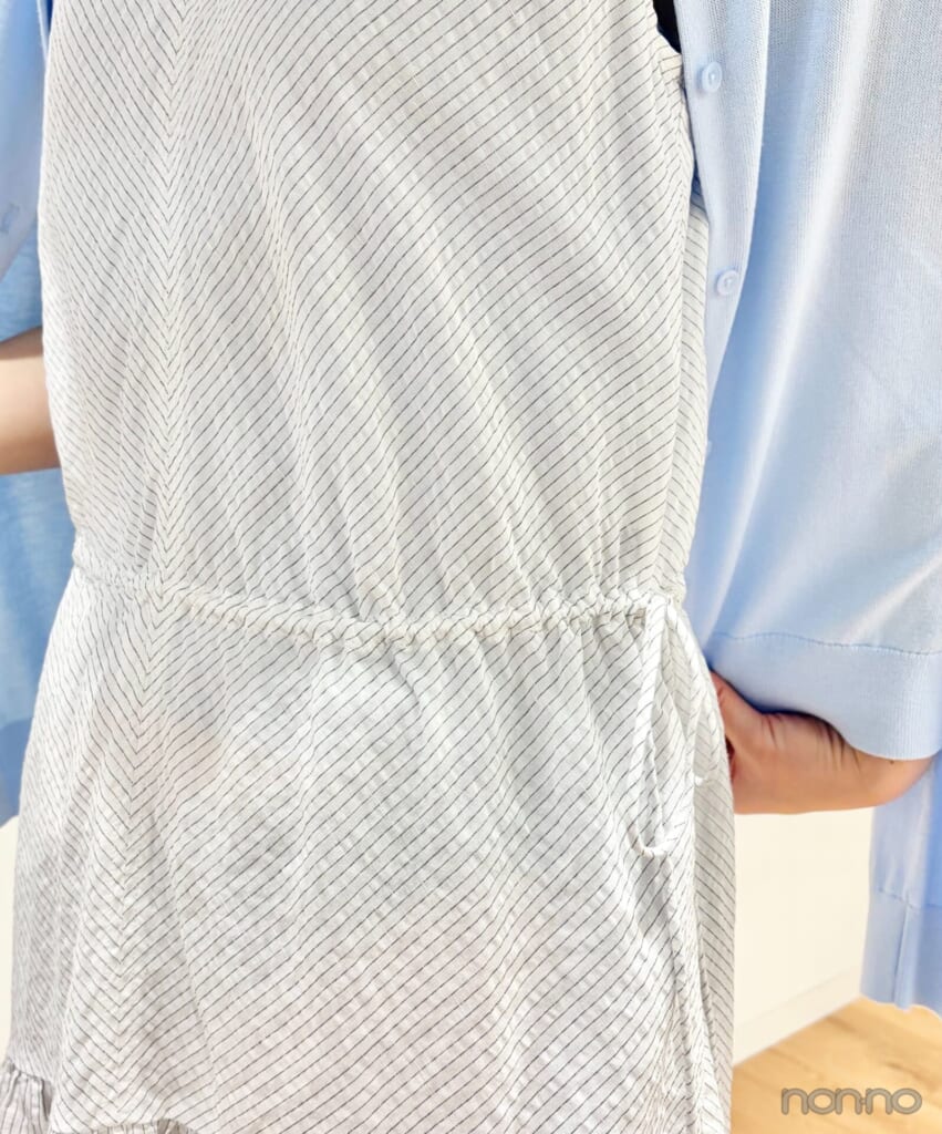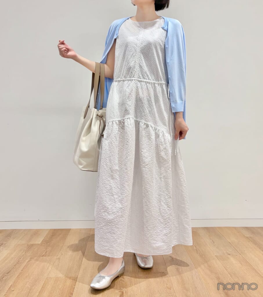 コットンリネンブレンドのシアサッカー素材を使用したワンピース。きれいめマキシ丈でリゾート感たっぷりなうえ、締めつけが一切ないので着心地も満点。表面に凹凸があってシワが気にならないから、長時間の移動にもおすすめ!