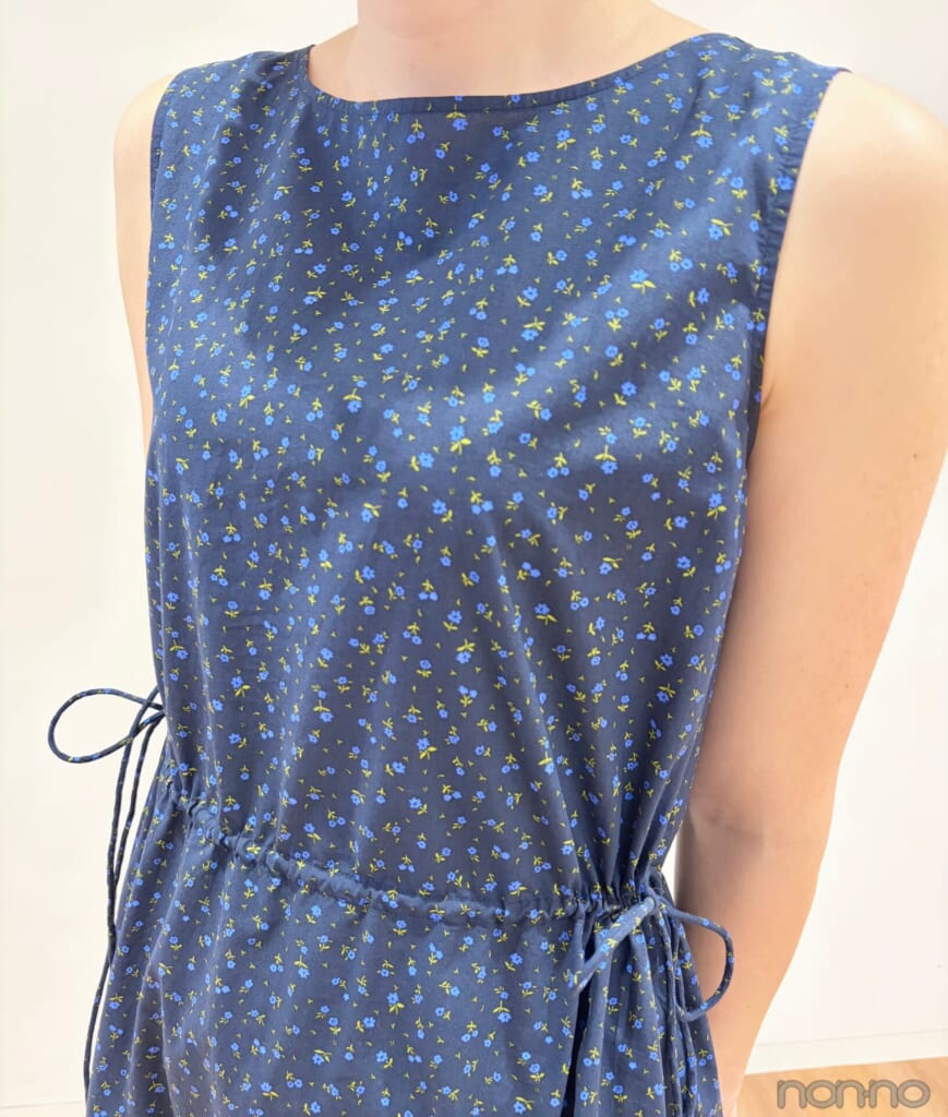 ネイビーのベースに、ブルーのお花をちりばめた涼しげなカラーリング。旅先でのディナーなど、ちょっとおめかししたいタイミングで着てみて。