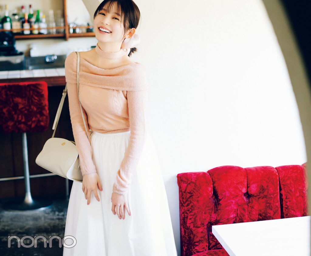 ちょっぴり気合いを入れておしゃれしたい日はタイつきオフショルニットでほんのり色気を。ヘアアクセやバッグも淡いトーンでまとめ、春の女子会を満喫。