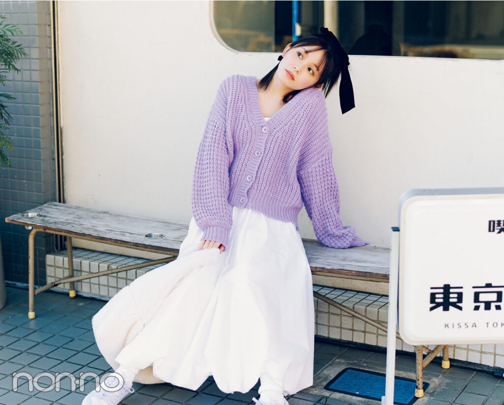 仲よしの友達に会う日はラフさとしゃれ感のバランスが絶妙なラベンダーカーデを合わせて。高めにつけたベロアリボンバレッタで、コーデの旬感が一気にアップ。