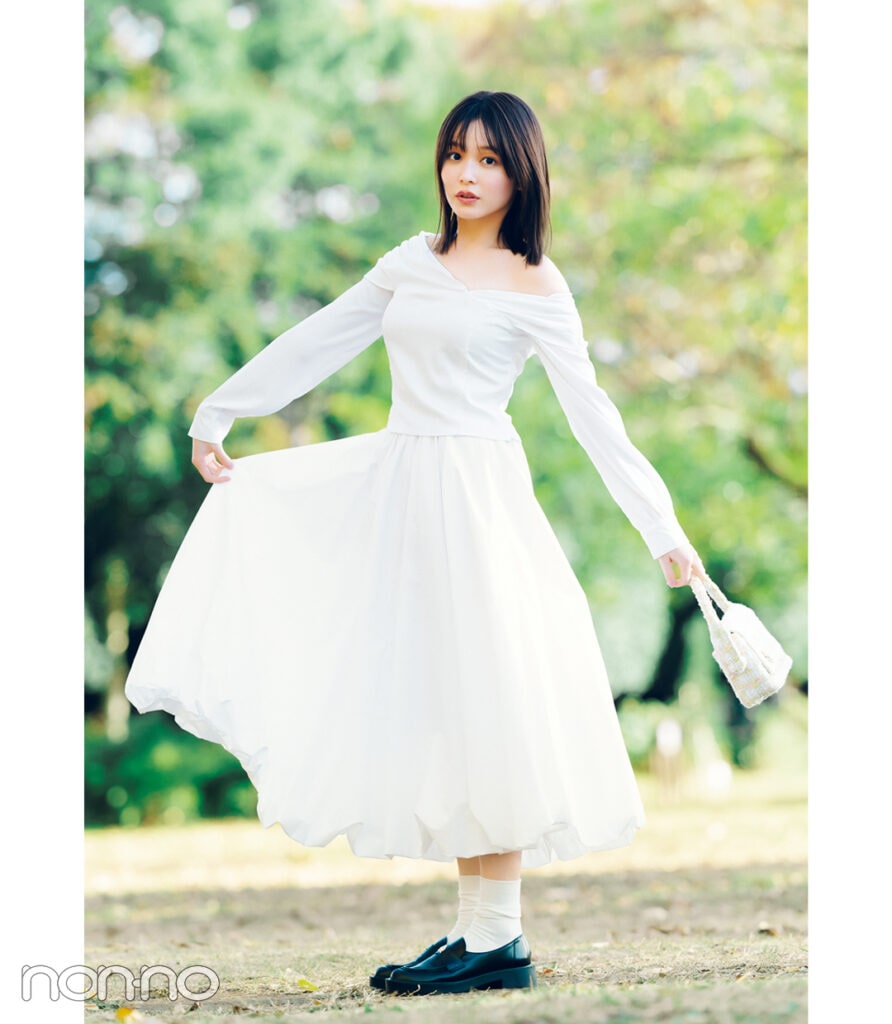 春らしいワンツーコーデは潔く白でまとめて、新緑の公園に映える着こなしに。タイトなアシメトップスを合わせることでメリハリがつくから、のっぺり見えを防止。