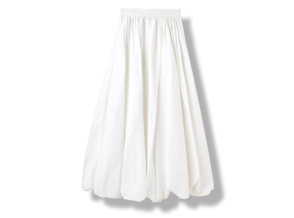 人気続行のバルーンスカートは春の気分が高まる白を支持する声が多数! 甘めはもちろん、カジュアルにも大人っぽくも使えるロング丈が間違いなし。