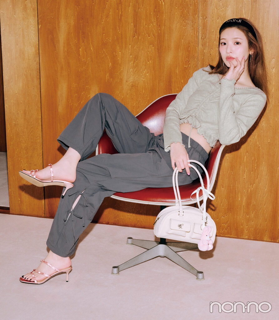 パッと見はカジュアルだけれど、ちゃ〜んと甘さがキープされているのは、トップスとパンツにあしらわれたリボンのおかげ。シアーなフリルショルダーバッグでさらにミーハーなトレンド感をプラス。