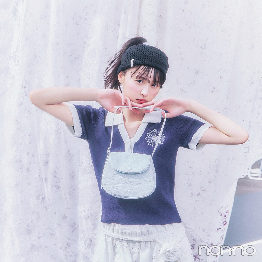 ニット¥22660(ノアイースターリー × ビームス ボーイ)・リング(3個セット)¥2970(ビームス ボーイ)/ビームス ボーイ 原宿 ジャケット¥33000・スカート¥19800/アー・ペー・セー カスタマーサービス(アー・ペー・セー) カットソー¥3960/アルシーヴ 帽子¥9900/ウーア バッグ¥12980/シップス インフォメーションセンター(シップス) 靴下¥1540/Tabio(靴下屋) 靴¥24200/ル タロン 有楽町マルイ店(ル タロン)