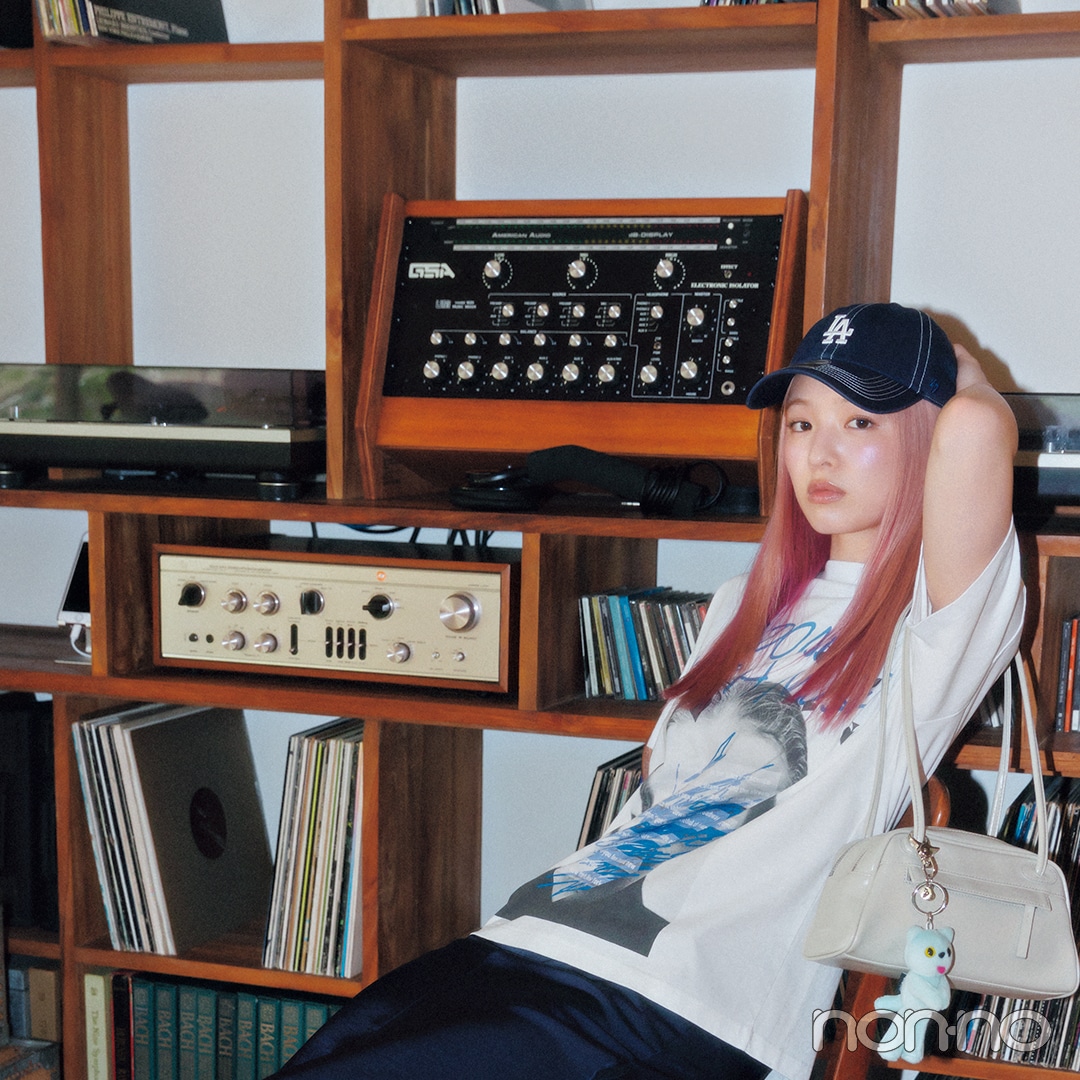 「このバッグは、あまり荷物が入らないのですが(笑)、アクセ感覚で持ちたいな、と思い購入しました。いつも黒メインのコーデが多いので、その中に1点きれい色の小物が加わると、ほどよいアクセントになるんです。リングはすべて韓国のアクセサリーショップ『時空間』のもの。壁一面に商品が陳列されていて、その中から掘り出しものを探すのが楽しくて! 身につけているリングは900円〜1000円程度と、びっくりするほどお買い得」