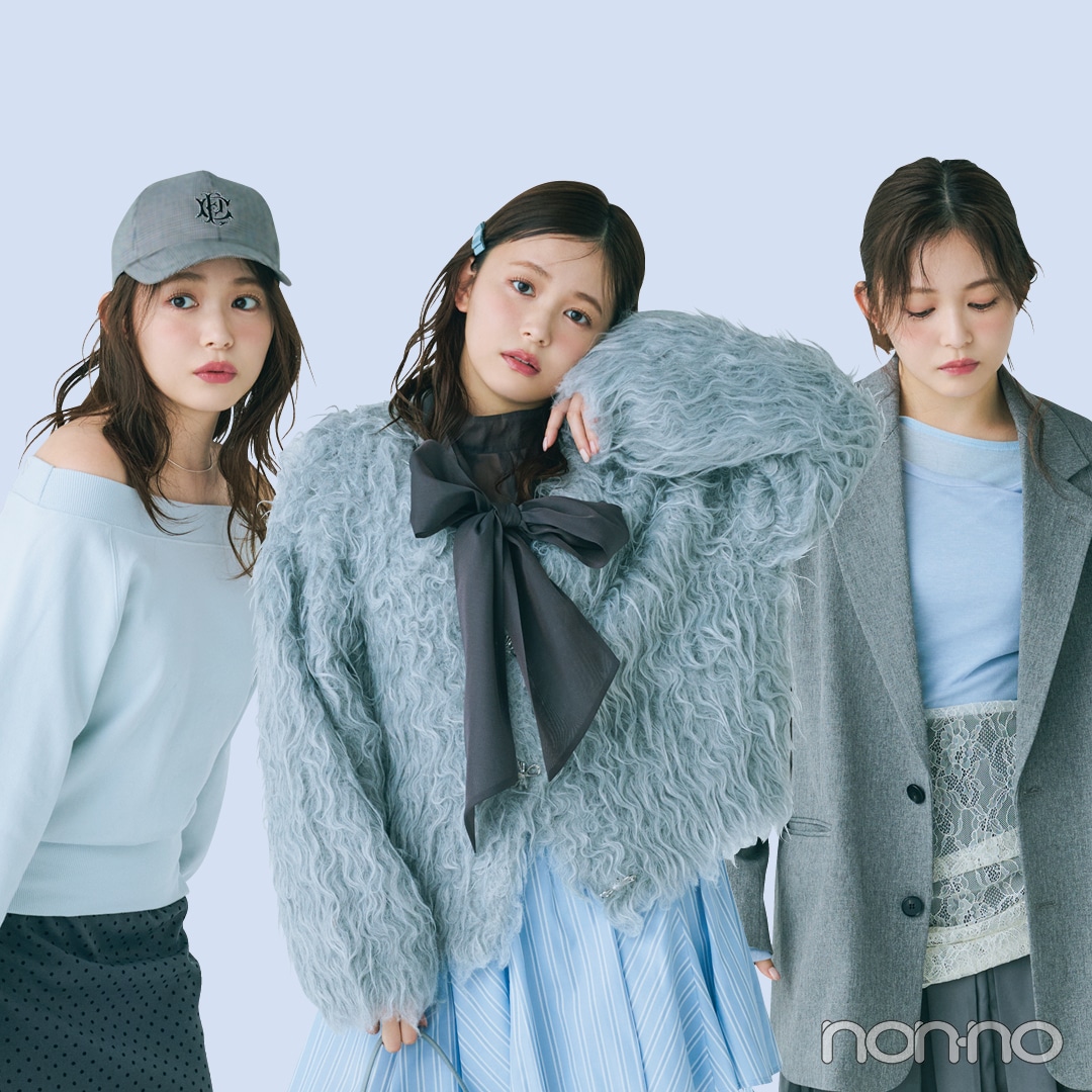 久間田琳加の春のパステルカラーコーデ。ブルーはグレーとの同系色ワントーンで大人っぽく