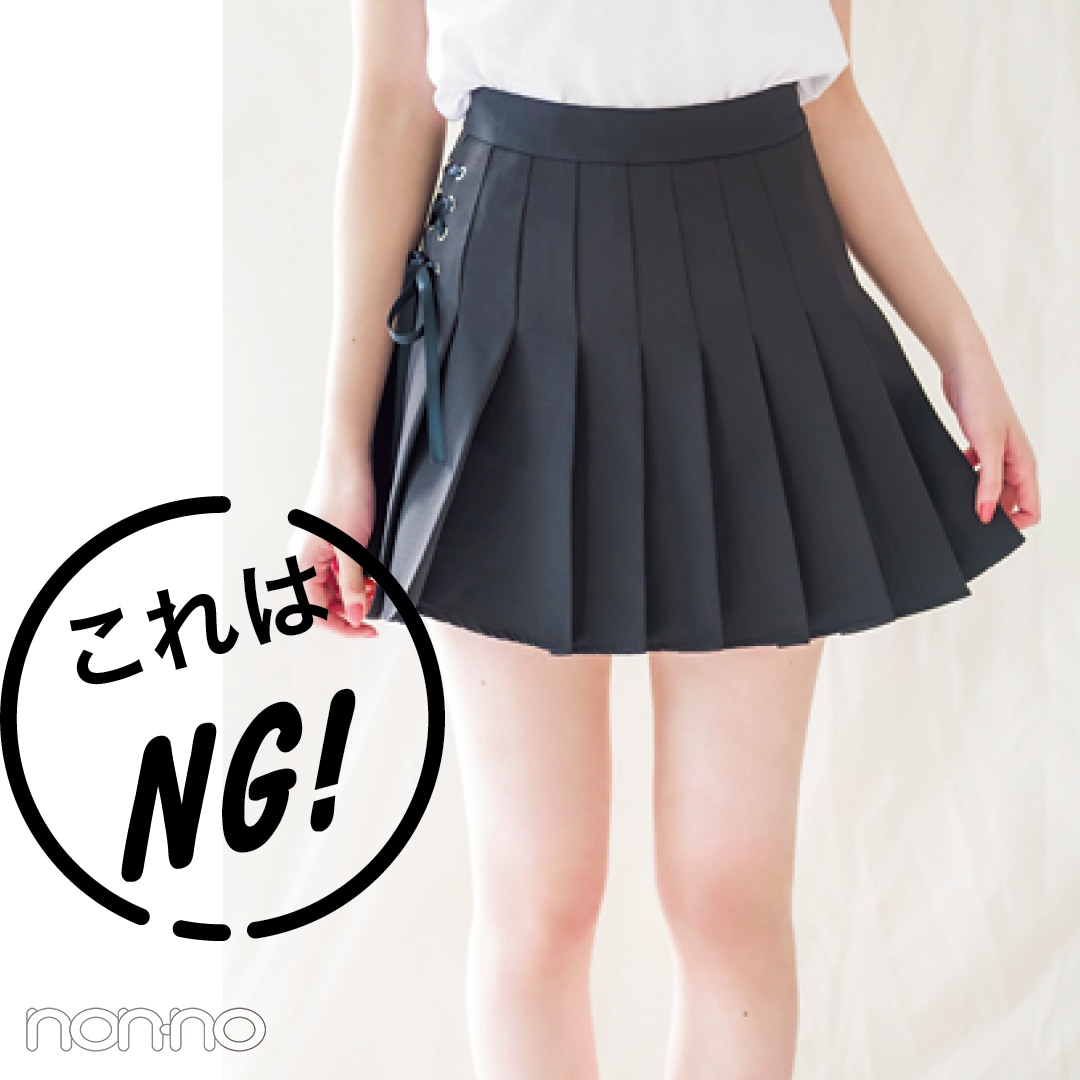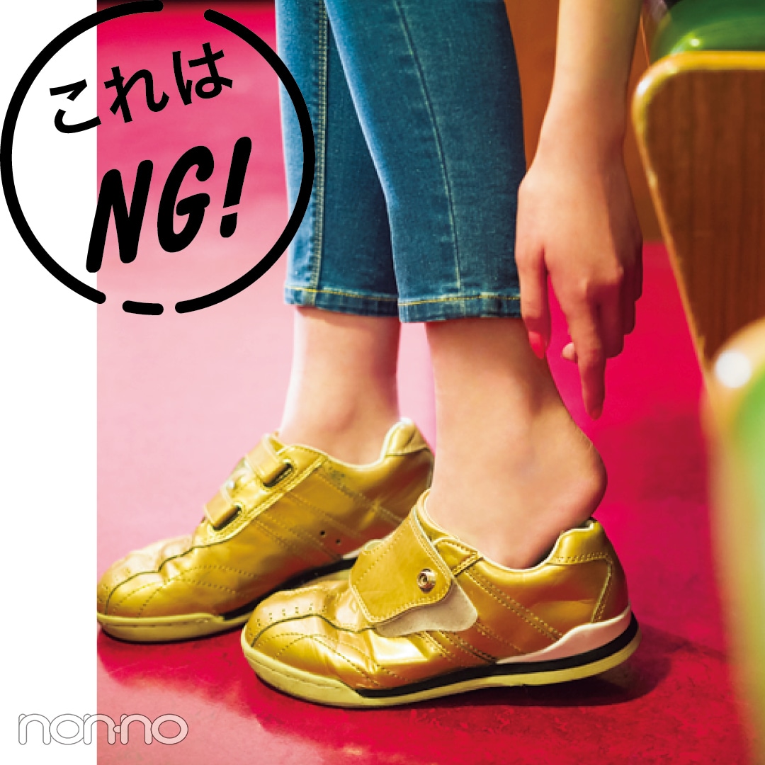 カジュアルな靴にはき替えても違和感のないコーデが◎。甘すぎに注意!!