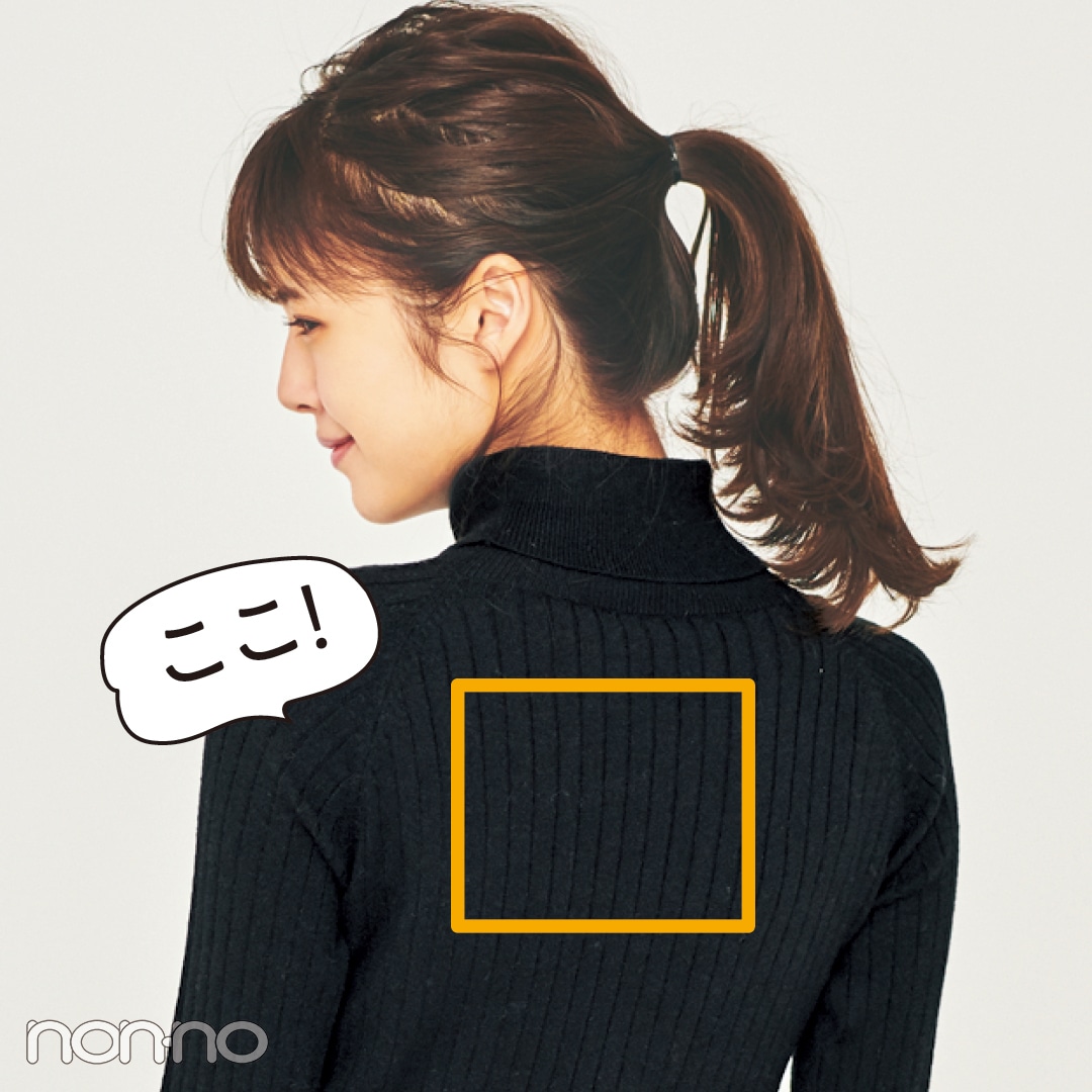 インナーに貼る場合は、一番暖かい両側の肩甲骨の間に。また、アウターの内側に貼っておくと、外でだけ暖かくて実用的。両側の肩甲骨に当たる位置に貼れば、脱いだ時も目立たない!