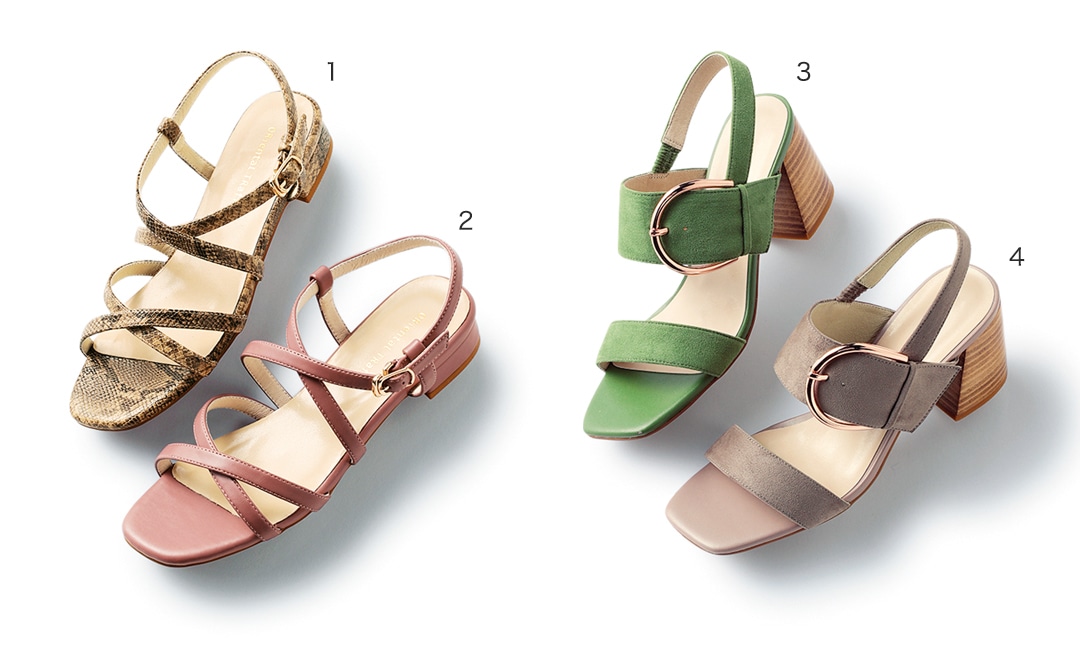 1・2スクエアトウ、細いストラップと、今年のトレンド要素が詰まった1足。パイソンやくすみカラーでこなれ感が際立つ。サンダル(各)¥5500・3・4存在感のあるバックルが四角いトウと相乗効果を発揮。きちんと見えするモード感で大人の女性に一歩近く。サンダル (各)¥6500/ダブルエー(オリエンタルトラフィック)