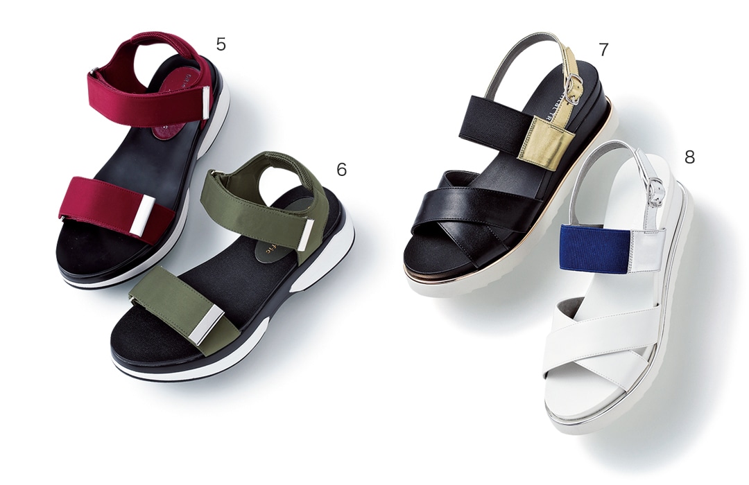5・6モデル着用の別色がこちら。深みのあるレッドならさりげない色気をプラス。カーキはカジュアル派にオススメの着回し万能カラー。サンダル(各)¥6500・ 7・8メタリックとのコンビでシャープな印象に。甲のゴム部分がはき心地とルックスの両方に技アリ。サンダル(各)¥6500/ダブルエー(オリエンタルトラフィック)