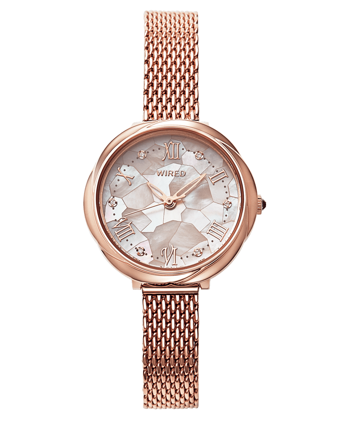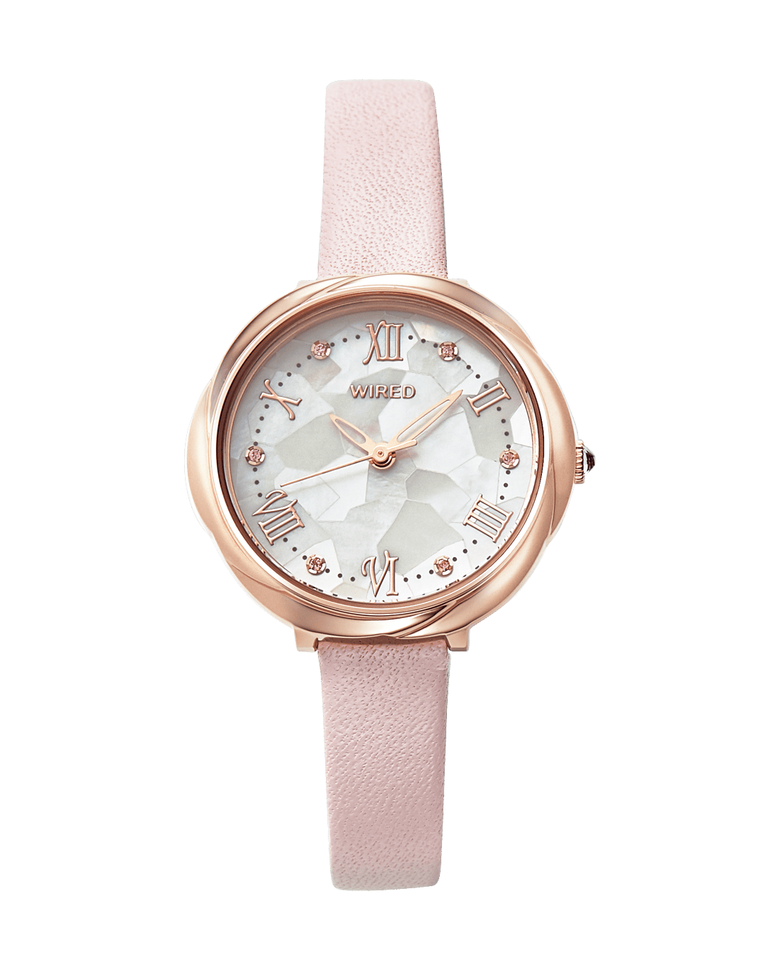 手元にみずみずしい花が咲いたような、好感度の高い腕時計が毎日の味方! 上品なピンクゴールドをベースに、白蝶貝がモザイク状に輝くフェイスがはっと目を引いて。ダイヤルにあしらわれたスワロフスキークリスタルで、ピュアなきらめきをオン。花びらを思わせるベゼルのデザインも大人っぽい華やぎを感じさせて、お出かけから通学、お仕事まで、シーンを選ばずおしゃれを格上げしてくれる♪