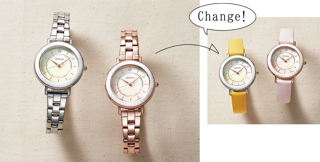 (左)ファッション感度の高い人は、シルバー×イエローのチェンジャブルレザーベルトつきを。ベルトのつけ替えでパッと印象が変わって新鮮! 時計[AGEK463]¥22000・(右)ピンクゴールド×ライトピンクのチェンジャブルレザーベルトつきは、大人っぽさと可愛らしさ、両方欲しい人におすすめ! 時計[AGEK464]¥24000/セイコーウオッチ(ワイアード エフ)
