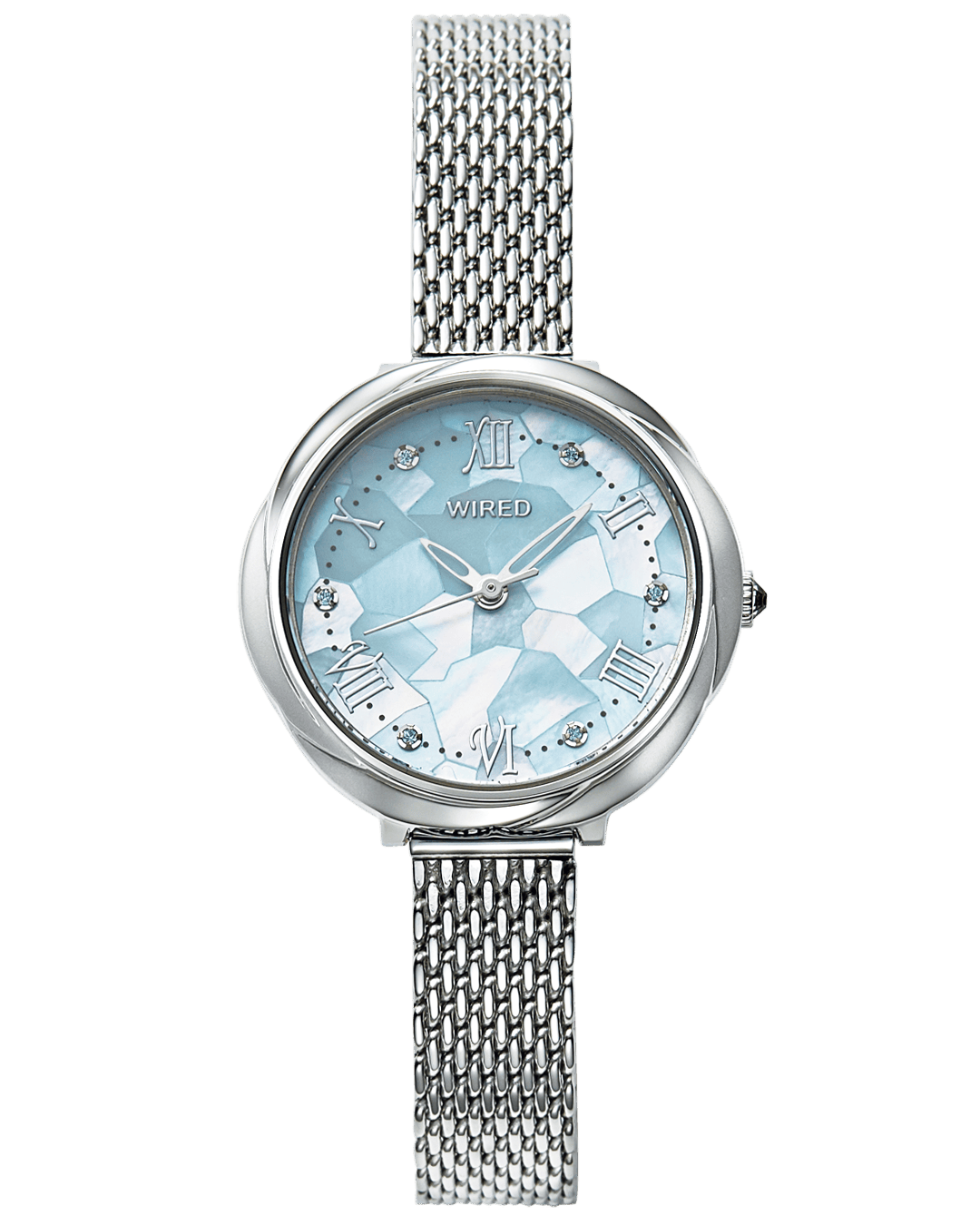 アイシーなブルーの白蝶貝モザイクとシルバーステンレスの細身ベルトのバランスは、清楚で知的なムード満開。まるで幸せを呼ぶブルーの花束のように透明感をたたえた愛らしさで、フリルブラウスのデートスタイルにすっきりとした印象をプラスしてくれる。きりりと見せたいお仕事シーンにも活躍間違いなし!