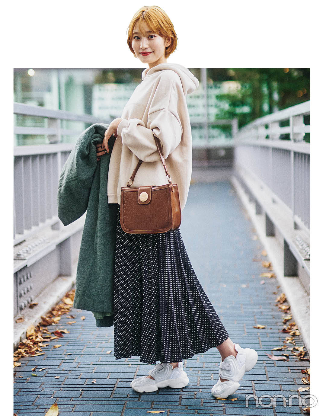 今一番ヘビロテしてる『ナイキ』の足袋スニーカー。相性抜群なフーディは、カジュアルになりすぎないヌードカラーを選びました。1枚でぐんと上品見えするプリーツスカートは『ZARA』。くるぶしがちらっとのぞく丈感が絶妙で、自然と抜けが出てバランスがよくなるんです!