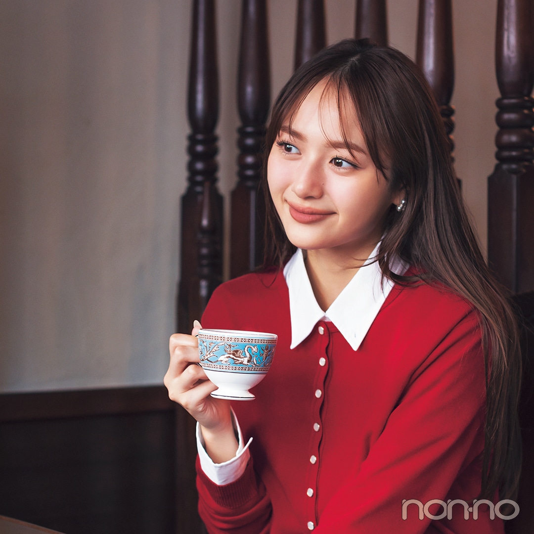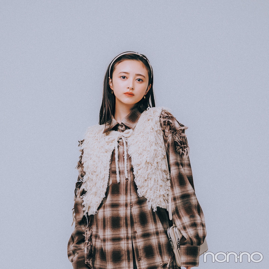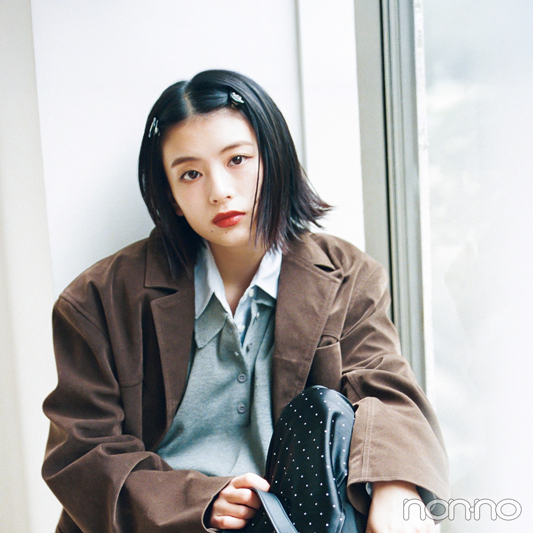ジャケット(ベルトつき)¥17600・ニット¥4950/MERCURYDUO ルミネエスト新宿店 ワンピース¥7920/キャンカスタマーセンター(テチチ) 帽子¥1499/H&M カスタマーサービス(エイチ・アンド・エム) イヤリング¥1680/クロスコミュニケーション デザインラボ(ルーム) ネックレス¥2948/サンポークリエイト(アネモネ) バッグ¥9900/キャセリーニ(ル・ベルニ)