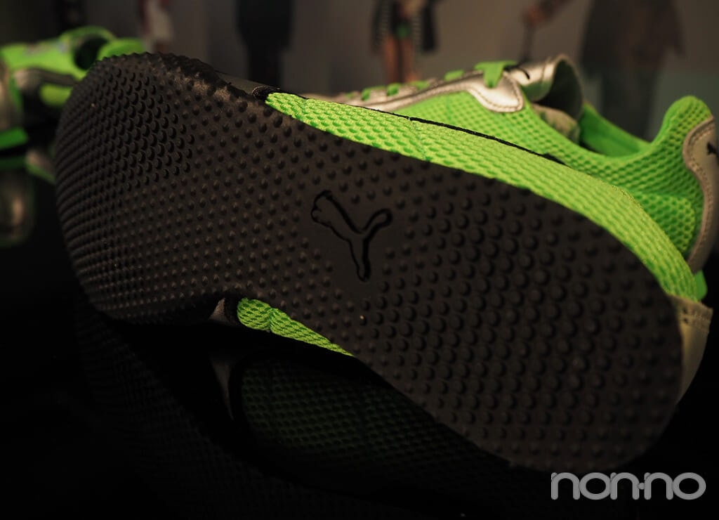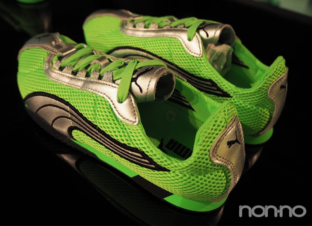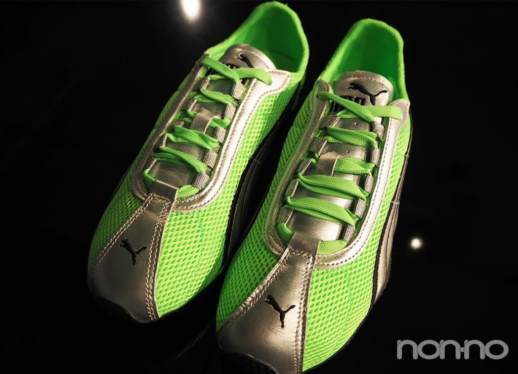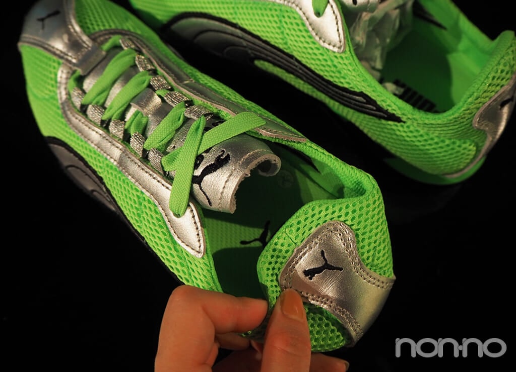 モードにもカジュアルにもはけるグリーンがイチオシ! ネオングリーンのボディ、シルバーのタンやラインがフューチャリスティックな一足。
